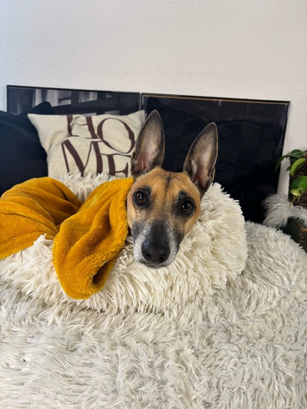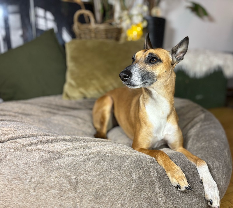 Ansa (17.01.2021) ist eine lebhaft verspielte und anhängliche Hündin mit sehr viel freudiger Lebensenergie. Sie liebt es zu rennen, da kommt der Windhund in ihr durch und sie apportiert leidenschaftlich gut und gerne. Ansa ist mit ihren neun Kilos eine zarte Hündin, welche ein liebevolles Umfeld sucht. Im Alltag benötigt sie Ruhe, Struktur und eine faire Führung. Bei Hundebegegnungen oder sonstigen unerwarteten Situationen springt sie bellend in die Leine und pöbelt. Daher trägt sie draussen eine Maukorb. Zuhause ist sie eine wunderbare ruhige Lady, welche gerne im Bett, in kuscheligen Decken eingepackt und am besten nahe an ihrem Menschen schläft. Eine Kuschelmaus eben.