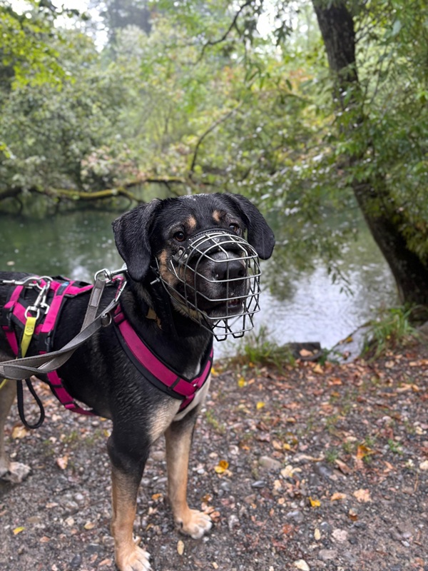 Hat sie Vertrauen gefasst, zeigt sich Bella verspielt, neugierig und voller jugendlicher Energie. Sie liebt gemütliche Spaziergänge, plantscht begeistert im Wasser und probiert gerne neue Dinge aus, sei es eine Leckerli-Suche oder das Balancieren über Baumstämme.