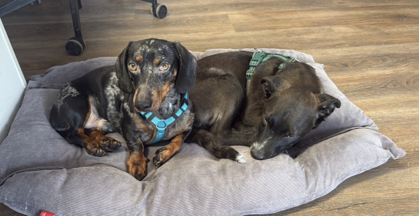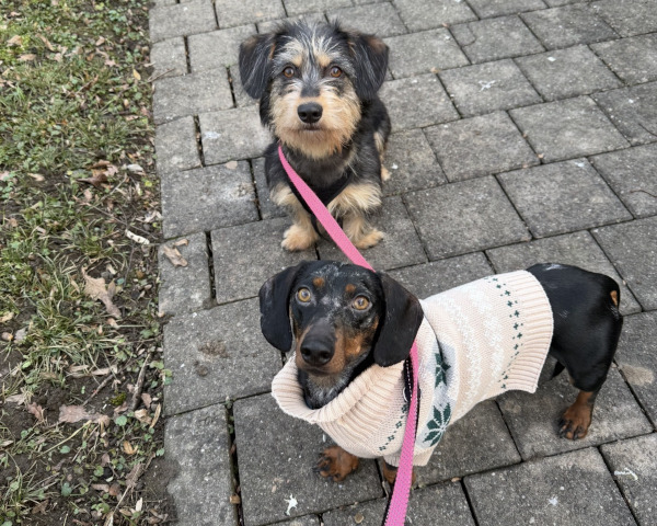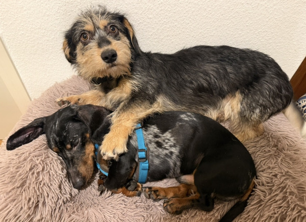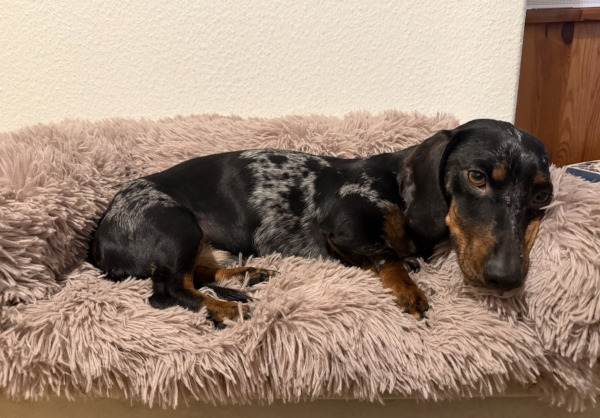 Pflegebericht vom 21.12.25: "Dio ist eher ein Einzelgänger. Er braucht nicht wirklich andere Hunde um sich herum um glücklich zu sein. Er akzeptiert andere Hunde, interagiert aber gar nicht mit ihnen. Dio ist ein typischer Dackel, sehr stur, sehr witzig und sehr liebevoll. Er muss noch vieles lernen und braucht daher klare Grenzen und Strukturen. Anhand seiner Ohren, sieht man gut, dass auch er öfter in seiner Vergangenheit angegriffen wurde. Er greift meine Rüden nicht immer an. Er attackiert aus Eifersucht oder allenfalls auch aus Ressourcenverteidigung. Deshalb trägt Dio einen Maulkorb. Er ist aber nicht von meinen Hunden getrennt. Er kuschelt sich zum Schlafen an sie. Er akzeptiert den Maulkorb ganz gut. Auch er geniesst die Zuneingung und Aufmerksamkeit sehr!"