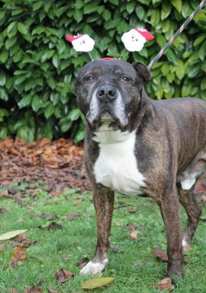 Inzwischen ist er ein echter Opi von 12 Jahren. Vom Volumen kommt der Koloss eher nach dem Cane Corso, der in ihm steckt. Als Rasse hat der Tierarzt Cane-Corso-Staffmix eingetragen.