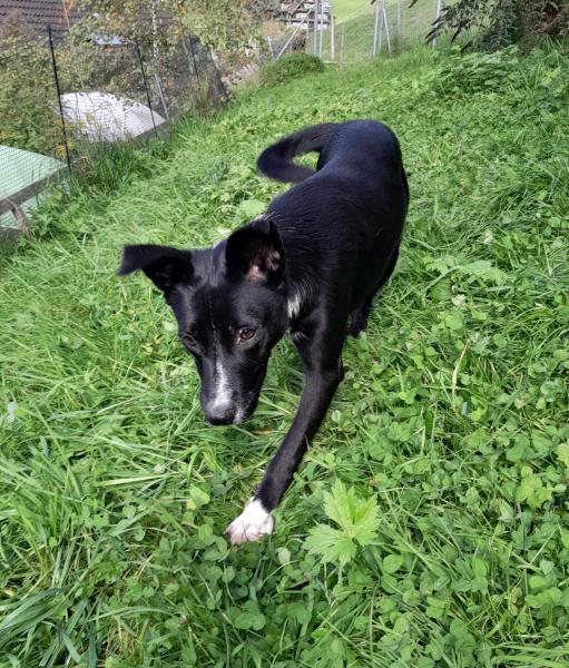 Josie durfte ende September auf ihre Pflegestelle in Ebnat-Kappel reisen, wo sie, nach Absprache, gerne besucht werden darf. Sie ist eine überaus freundliche kleine Hündin, die noch sehr verspielt und welpenhaft in ihrem Verhalten ist. Sie kommt mit allen Hunden im Rudel gut zurecht und holt sich gerne Streicheleinheiten bei ihren Bezugspersonen ab, kann da auch mal etwas fordernd sein, akzeptiert Grenzen jedoch gut. Josie geht offen aber vorsichtig an Neues heran und lernt schnell dazu. Sie kommt bereits gut zur Ruhe und kann sich auch selbstständig beschäftigen, nicht nur zur Freude der Pflegemama (Schuhe umgestalten, Löcher buddeln im Garten, usw.). Draussen läuft Josie schon ganz ordentlich an der etwas längeren Leine. Aussenreize sind ihr zwar noch etwas suspekt, sie orientiert sich jedoch gut am Rudel und an ihrer Bezugsperson. Die kleine Maus ist bereits stubenrein, fährt gerne Auto und kann schon etwas alleine sein gemeinsam mit dem Rudel. Katzen und Kleintiere lernt Josie gerade kennen. Die findet sie noch sehr interessant, lässt sich aber problemlos auslenken.