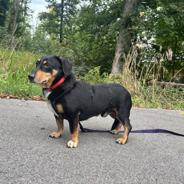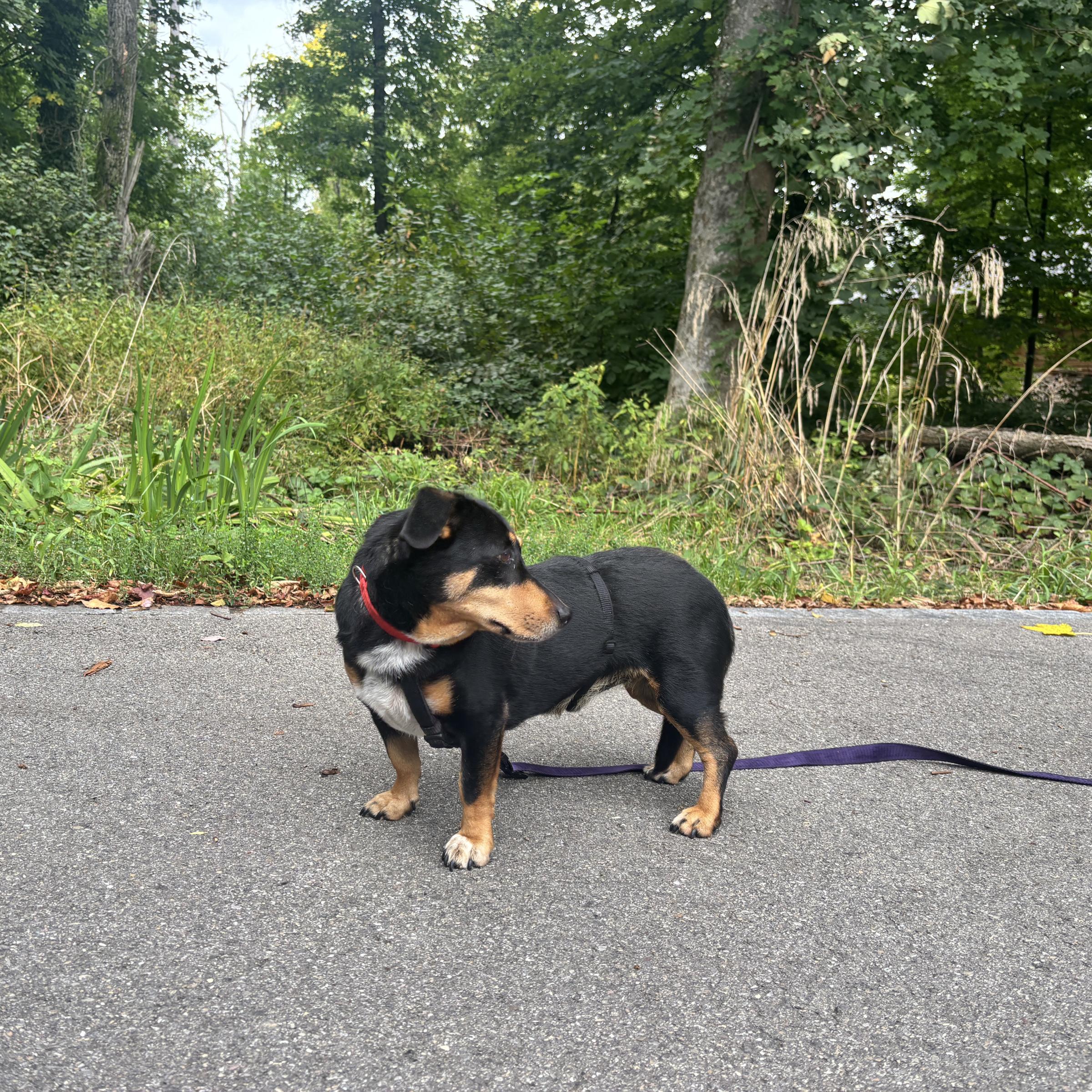 Mex geniesst es spazieren zu gehen, seine Rute und der ganze Körper wackelt dann vor Freude. Er läuft auch super an der Leine. Aktuell fehlt ihm noch etwas Kondition, auch später sollte die Aktivität seinen kurzen Beinen angepasst sein.