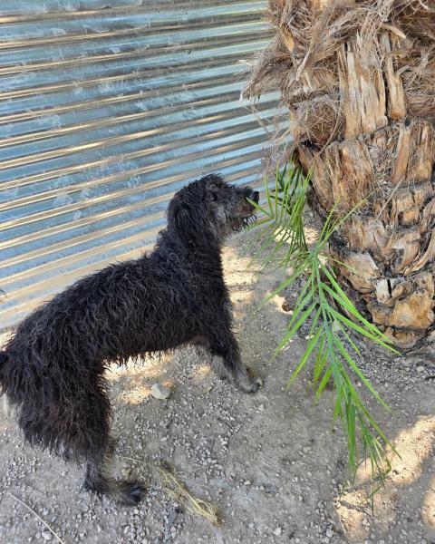 Ein aktiver, fröhlicher Junghund, der, wenn er mal aus dem Zwinger kommt, erstmal alles auf einmal absuchen und abschnüffeln muss. Er ist eine Mischung - wahrscheinlich von einem spanischen Wasserhund, sieht immer aus, als wenn er nass wäre - darum auch der Name “Mojito”.