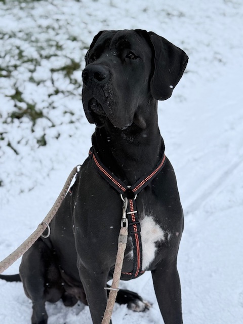 Leinenführigkeit braucht noch etwas , doch der Grundstein ist gelegt. Er hört auf Fuss, Sitz und kennt seinen Platz, wenn gekocht wird.