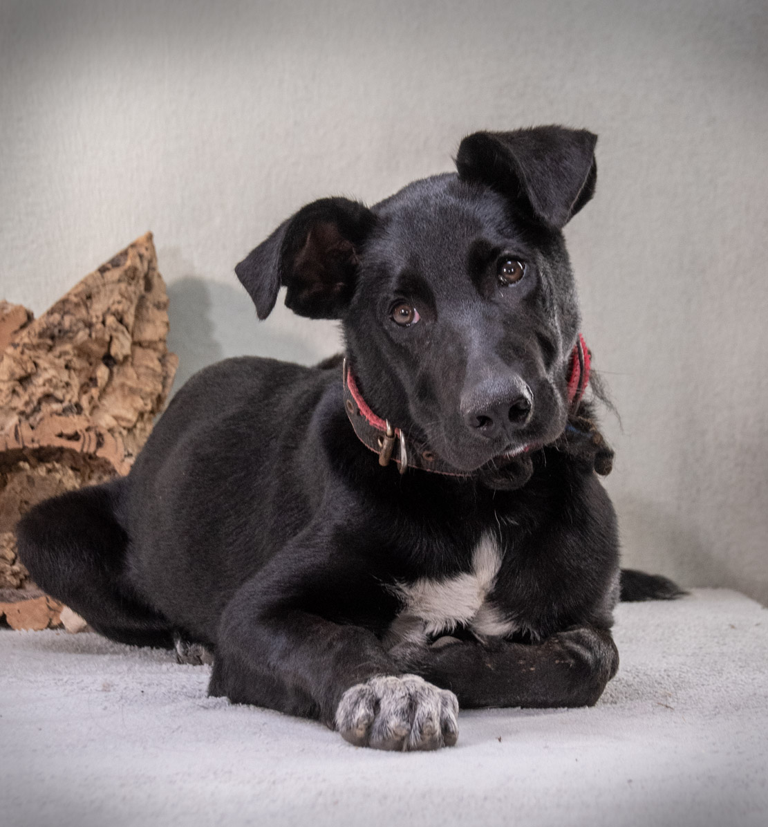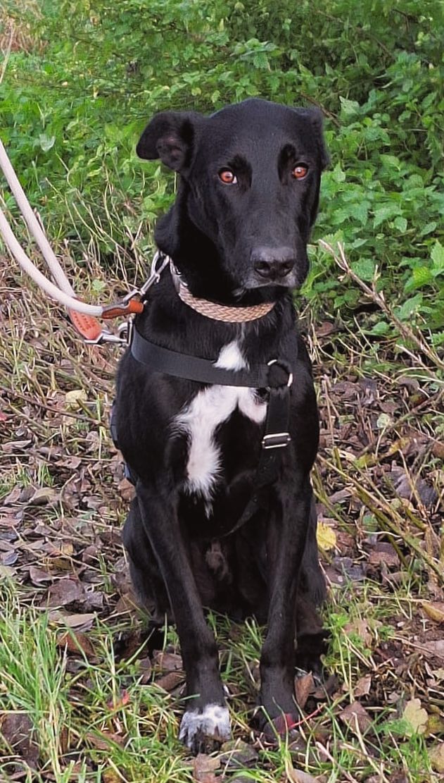 Pino ist ein Mischlingsrüde, geboren im Februar 2024, mit einer Schulterhöhe von etwa 53 cm. Er stammt aus Portugal, wo er als Welpe angebunden im Wald gefunden wurde – ohne Futter, ohne Wasser und in einem stark geschwächten Zustand. Der Strick um seinen Hals hatte sich bereits tief eingeschnitten, doch Pino hatte das Glück, rechtzeitig gerettet zu werden.