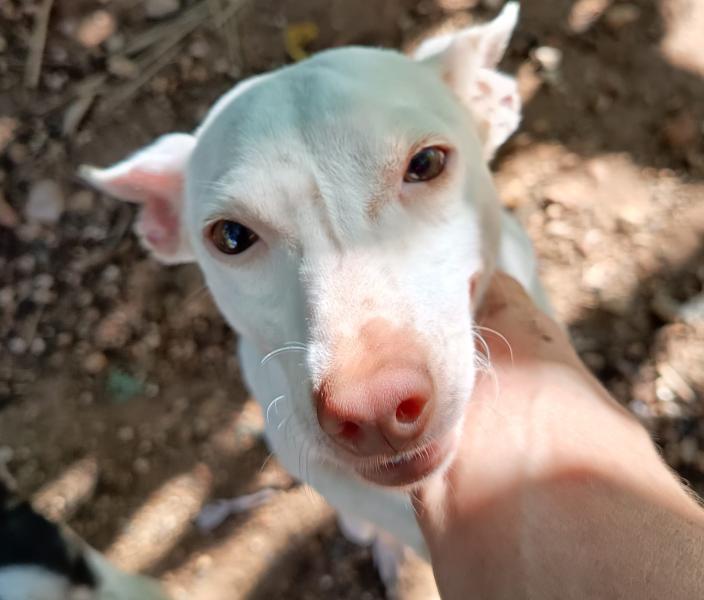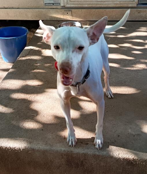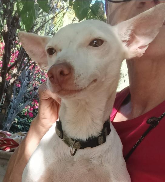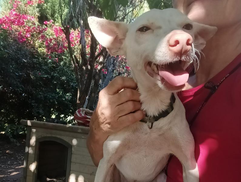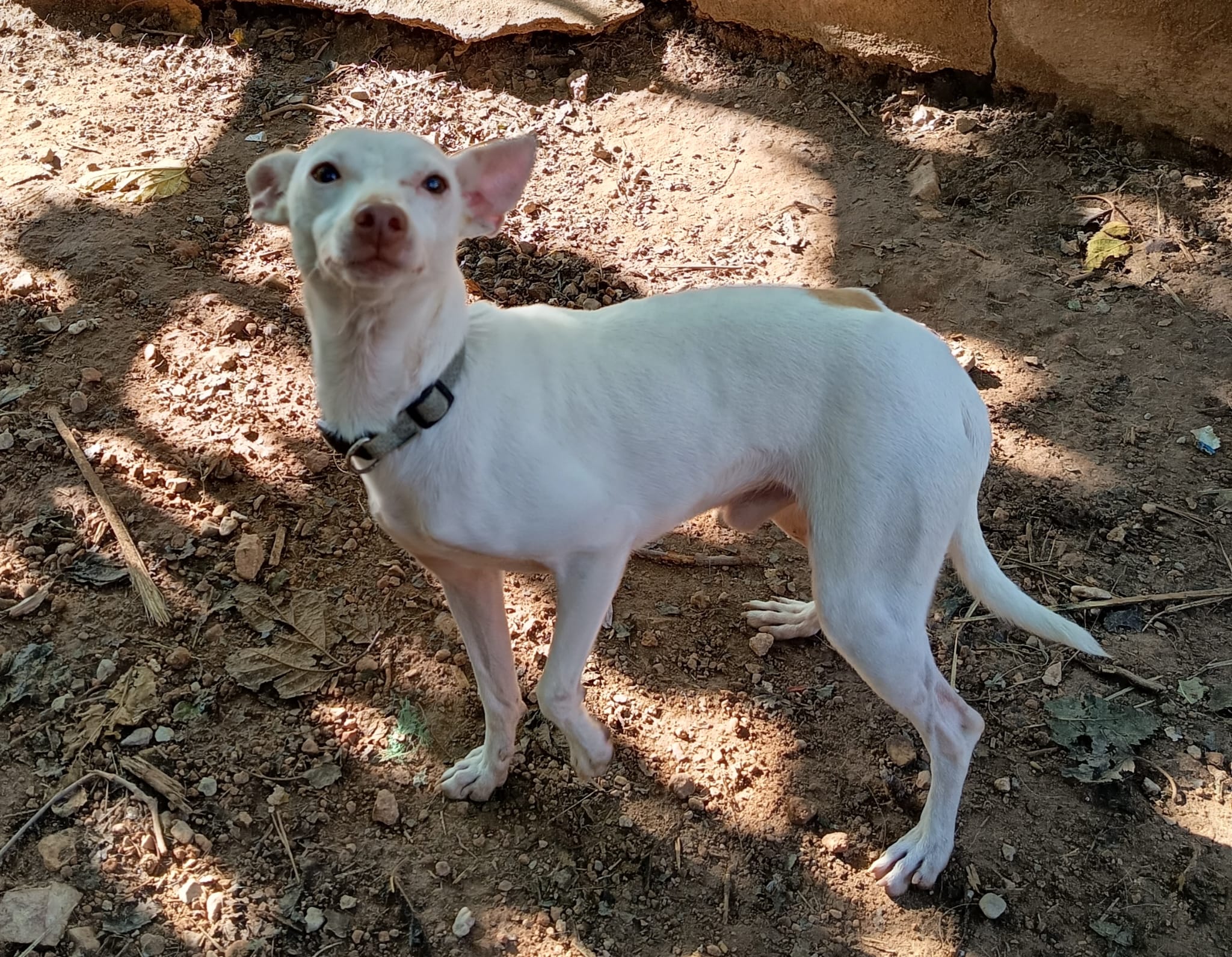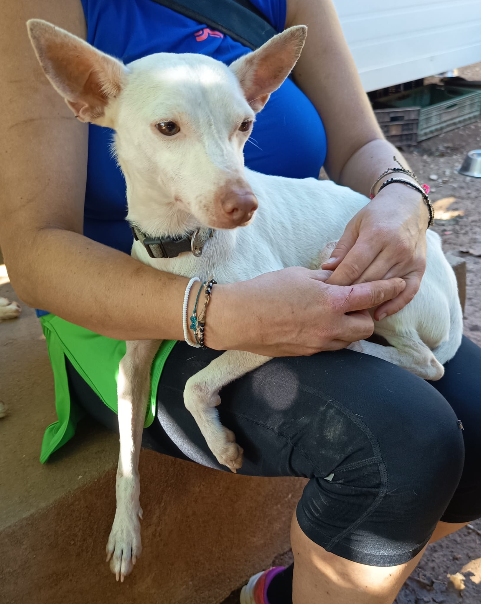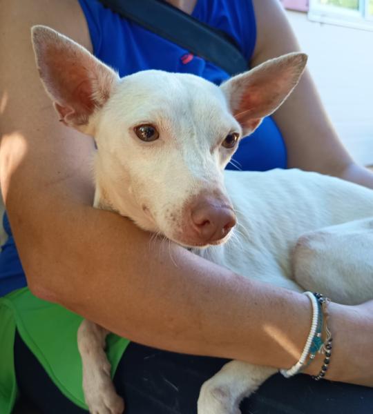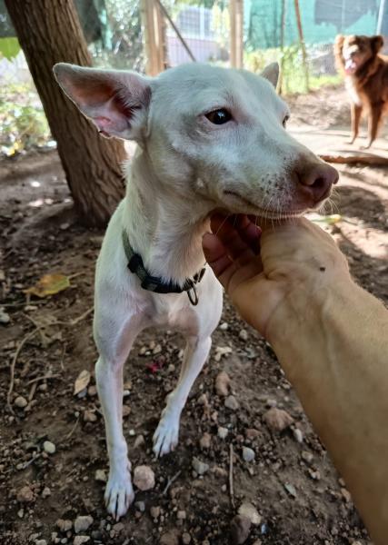 Am 15. Oktober 2025 kam aus der Perrera in Vinaros der kleine weisse Podenco Mischling Robi zu Monika in ihr Refugio. Sehr menschenbezogen und freundlich zeigte er sich da gleich von Anfang an. Er ist ein unbeschwertes agiles Kerlchen, das mit den anderen Hunden im Zwinger super klarkommt. Robi ist noch sehr verspielt, liebt es aber auch auf dem Schoss zu sitzen und gekrault zu werden.