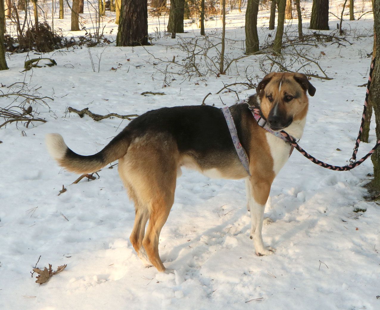 Bis dahin wartet er geduldig im Tierheim, wo er sich völlig problemlos ein Zimmer mit einem älteren Rüden teilt.