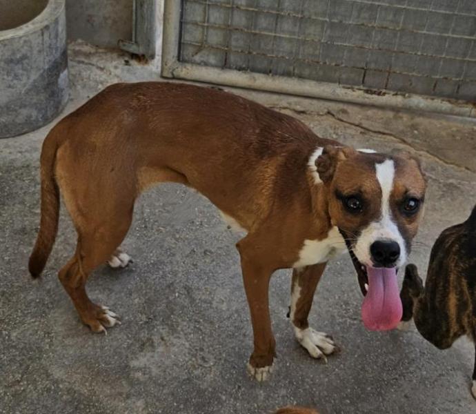 Terma wurde zusammen mit Gorgolito und ihrer Schwester in den Anhöhen oberhalb von Albatera gefunden. Die drei waren bei brütender Hitze unterwegs, sie hochträchtig, am Ende ihrer Kräfte und auf verzweifelter Futtersuche. Zum Glück wurden sie gefunden und gerettet – lange hätte sie nicht mehr überlebt. Am 30.07.2025 brachte Terma im Tierheim dann ihre Welpen zur Welt – nur zwei überlebten, Gerda und Benita.