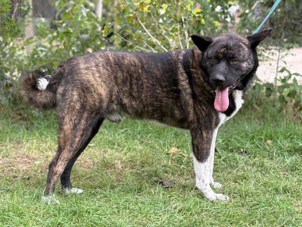 Zum Glück hat Vidar seine Vertrauen in die Menschen nicht verloren, was zeigt, was für einen tollen Charakter dieser Hund hat. Frauen schliesst er sich gleich an, bei Männer braucht er etwas Zeit, taut aber schnell auf, wenn er merkt, dass man es gut mit ihm meint. Vidar ist ein freundlicher, lieber, kräftiger, agiler und netter Kerl, der sich zum Glück recht gut in seine neue Lebenssituation einfügte. Er ist happy, wenn man ihm etwas Zeit und Aufmerksamkeit schenkt und freut sich über jede Streicheleinheit und Zuneigung, da hat er viel Nachholbedarf. Vidar ist im besten Alter und möchte geistig wie körperlich gefordert und gefördert werden. Zu Anfang gilt aber auch bei ihm: das Hundeeinmaleins lernen und festigen, das an der Leine laufen klappt schon ganz gut, an den Feinheiten darf noch weiter gearbeitet werden. Vidar ist ein schlauer Bursche, Akitas gelten als intelligente und unabhängige Hunde, welche aber bei falscher Führung auf stur schalten können und es wird bestimmt viel Spass machen, mit ihm zu arbeiten und zu trainieren. Er wäre sicher auch ein wunderbarer Begleiter beim Joggen, Fahrradfahren, Wandern oder anderen sportlichen Aktivitäten, Hauptsache Mensch und Hund haben Spass und eine gute Zeit zusammen. Mit seinen Artgenossen versteht sich Vidar gut lebt aber aktuell (12.5.2025) noch alleine im Kennel und es wird nach einem geeigneten WG Partner oder Partnerin Ausschau gehalten.