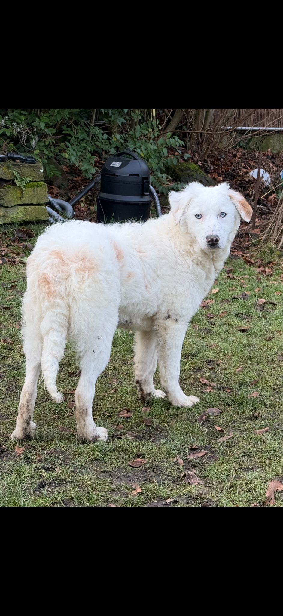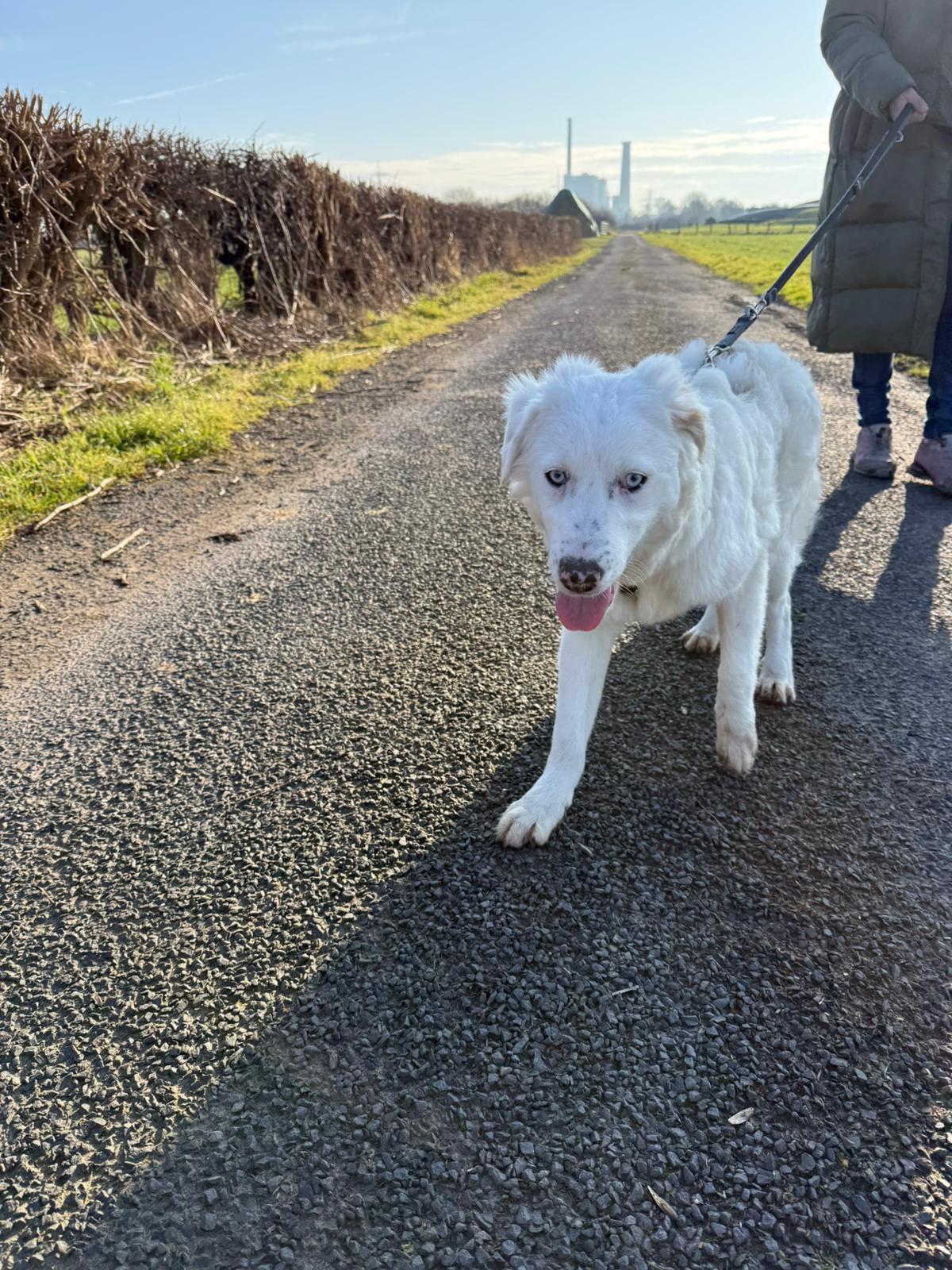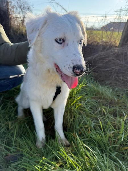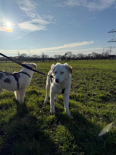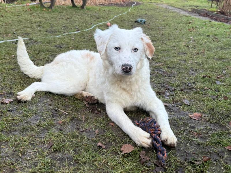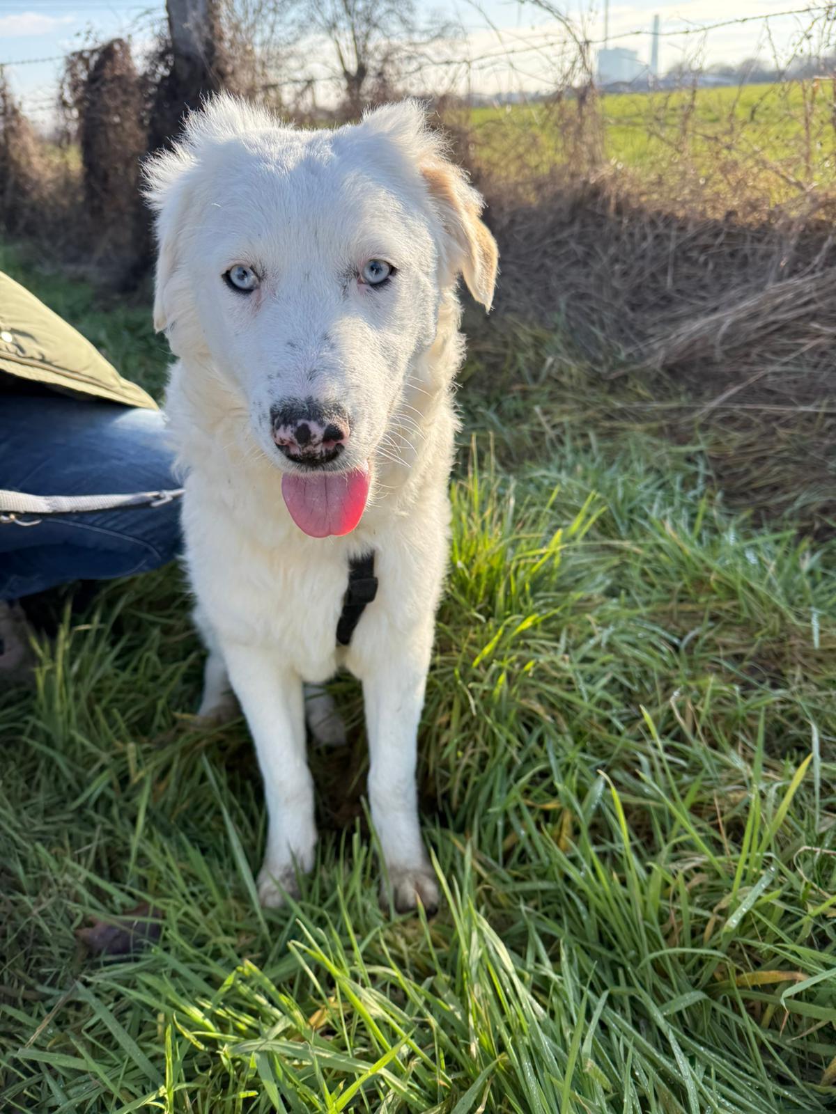 Yuki ist etwa 7 Monate alt (geboren ca. 07/2025) und wächst zu einer beeindruckenden jungen Hündin heran. Ausgewachsen wird sie vermutlich eine Schulterhöhe von etwa 55–60 cm erreichen. Mit ihren zwei strahlend blauen Augen zieht sie sofort alle Blicke auf sich – doch nicht nur ihre besondere Optik macht sie so besonders, sondern vor allem ihr liebevolles Wesen.