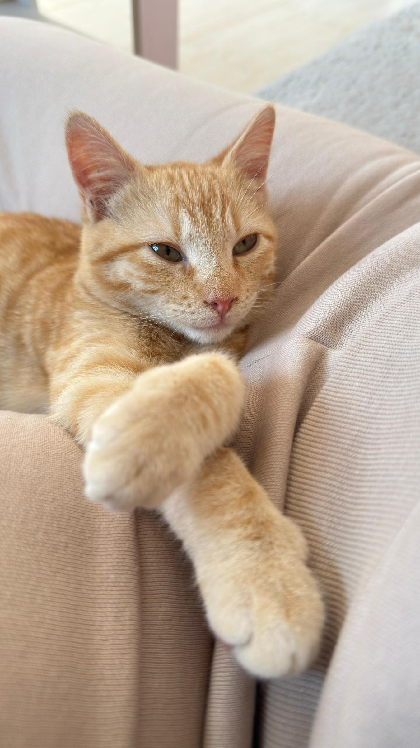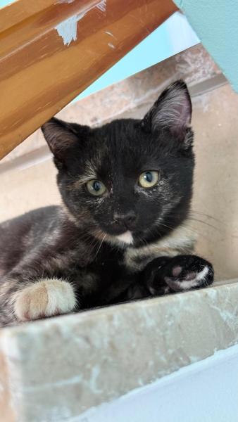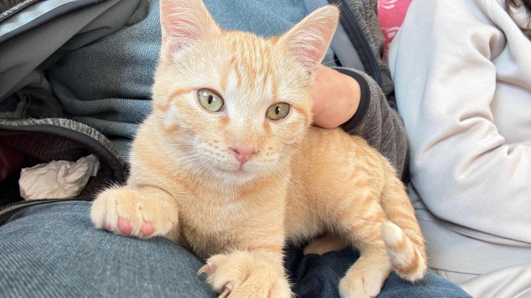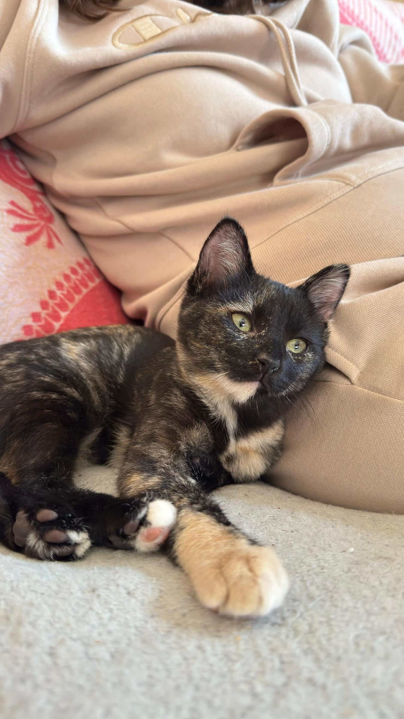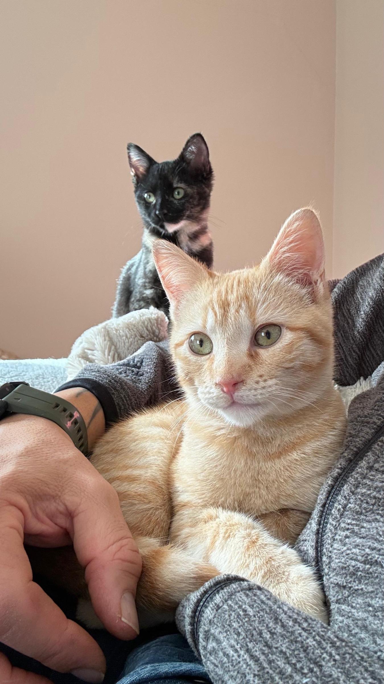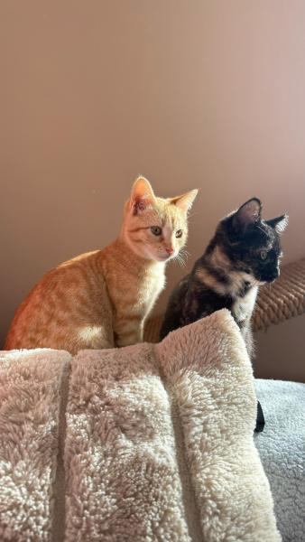 Bimbo (orange) und Juliette (Schildpatt) wurden in einer regnerischen Nacht auf einem Feld in der Nähe einer vielbefahrenen Strasse gefunden. Sie lagen eng zusammen, um sich zu wärmen. Da sie ganz alleine und sehr hungrig waren, hat man sie auf eine Pflegestelle mitgenommen, wo sie sich schnell erholt haben.