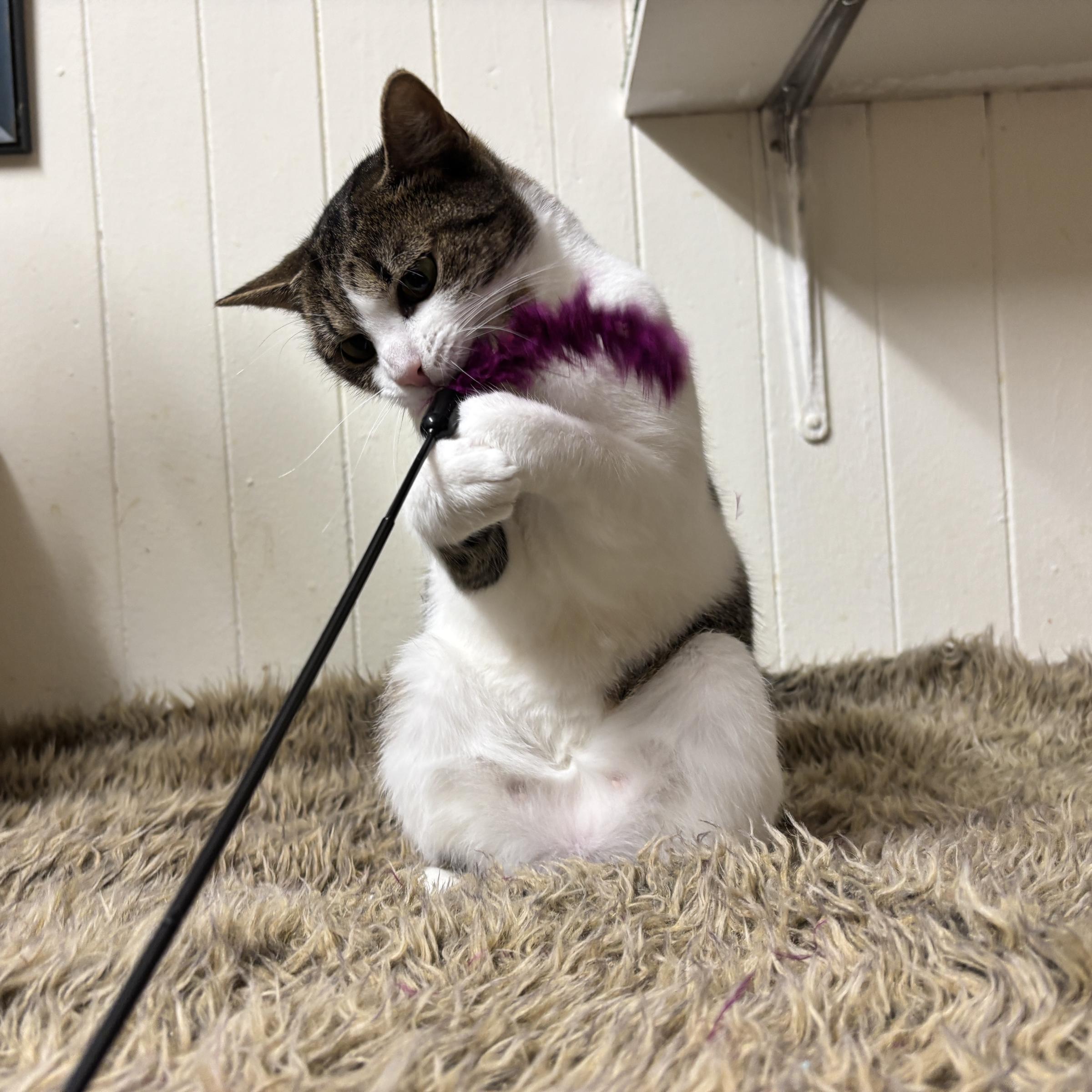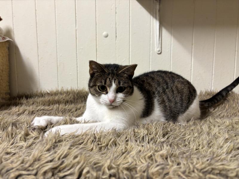 Lori, tiger mit weiss, ist am 1.1.2023 in Ungarn geboren, sie wurde in Ungarn beim Umzug zurückgelassen und bekam dann auf einem Lebenshof Babys welche sie liebevoll aufgezogen hat, alle Babys sind vermittelt. Lori kam am 1.9.2025 über unseren Partnerverein zu uns. Sie ist verschmust und verspielt.
