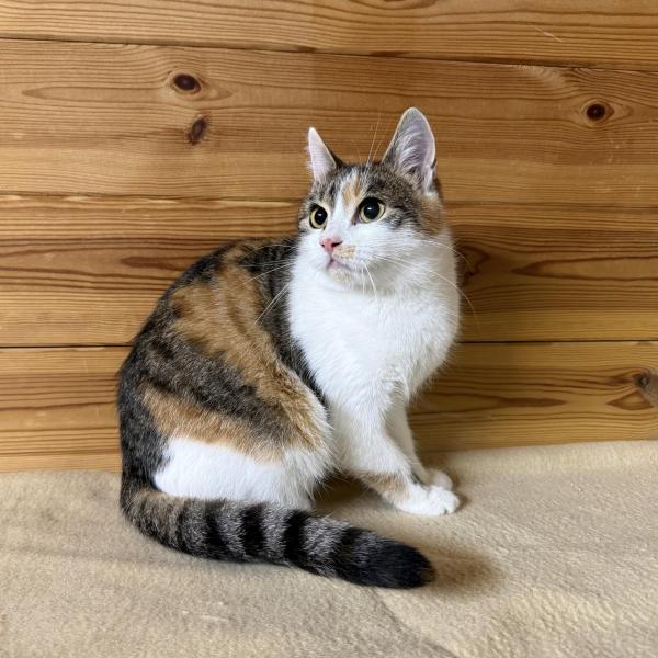 Eliza, die tricolor Katze, ist am 1.5.2020 in Ungarn geboren, sie kam mit ihren Babys in Ungarn auf den Lebenshof, hat diese grossgezogen. Sie kam am 17.11.2025 über unseren Partnerverein zu uns. auch sie ist sehr verschmust.