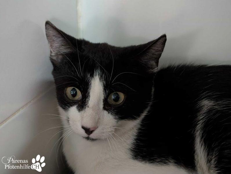 Kima ist eine schwarz-weiße Katzendame, die in kurzer Zeit eine tolle Entwicklung gezeigt hat. Anfangs war sie so schüchtern, dass sie keinerlei Menschenkontakt wollte. Inzwischen kommt sie zwar auch noch nicht von sich aus freudig auf das Team zu, lässt sich aber streicheln und kann es sogar genießen, wenn sie auf den Arm genommen wird. In einem eigenen Zuhause wird sie ihre Zurückhaltung bestimmt nach und nach ablegen können.