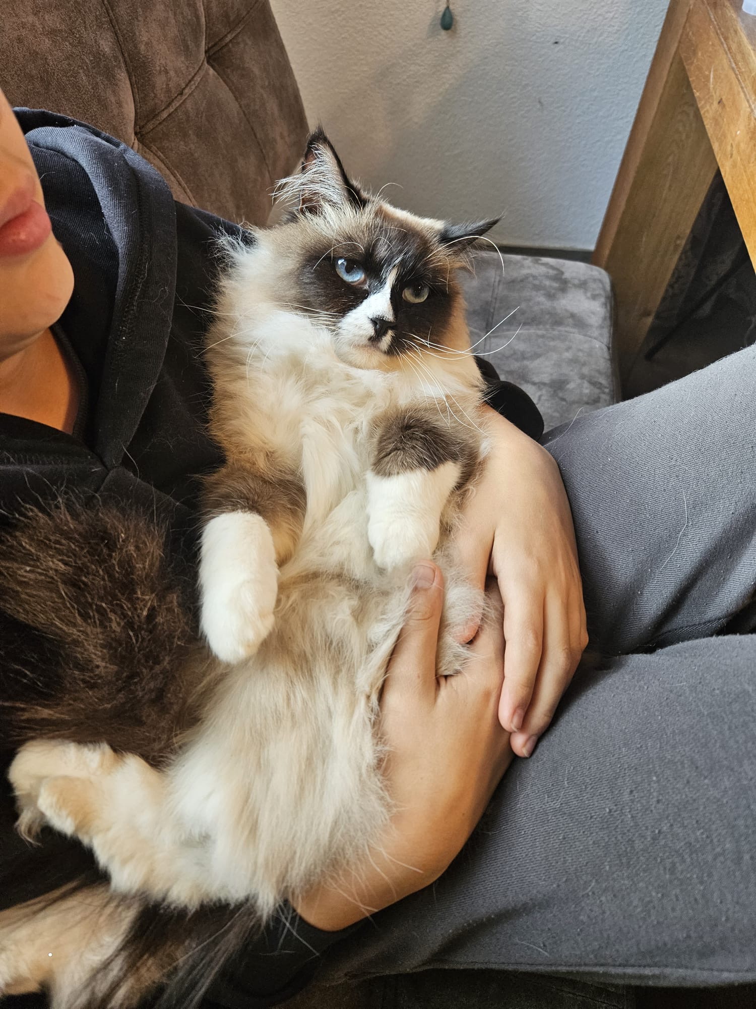 Minka ist eine sehr verschmuste Neva Masquerade Katze. (Sibirische Waldkatze) sieht optisch aus wie eine Birma) Sehr menschenbezogen und anhänglich. Eine wirklich süsse Katze die gerne beim Menschen ist.