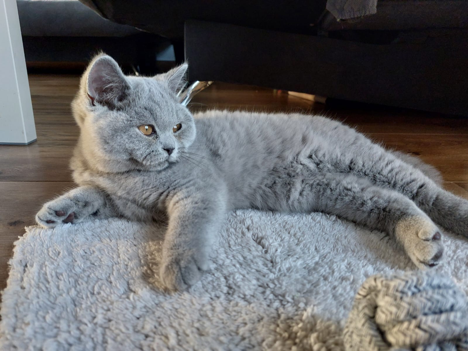 Die Mama Polly ist ein Britisch Kurzhaar blaues Weibchen (BRI a)