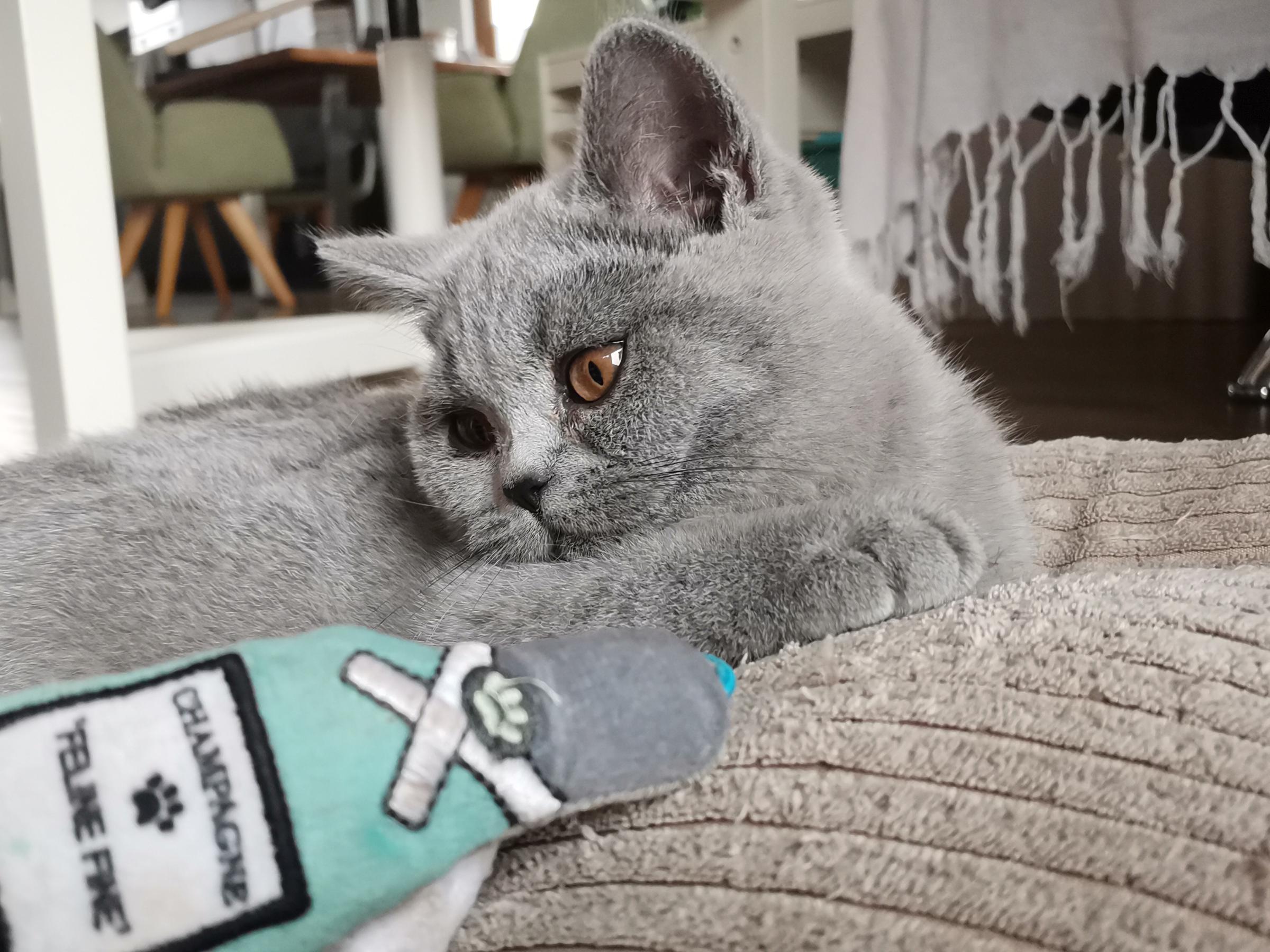 Sie mag die menschliche Nähe und begleitet eine durch den Tag. Nach dem Herumtoben mit ihrer Feder, geniesst sie ihre Kuscheleinheiten bei uns.