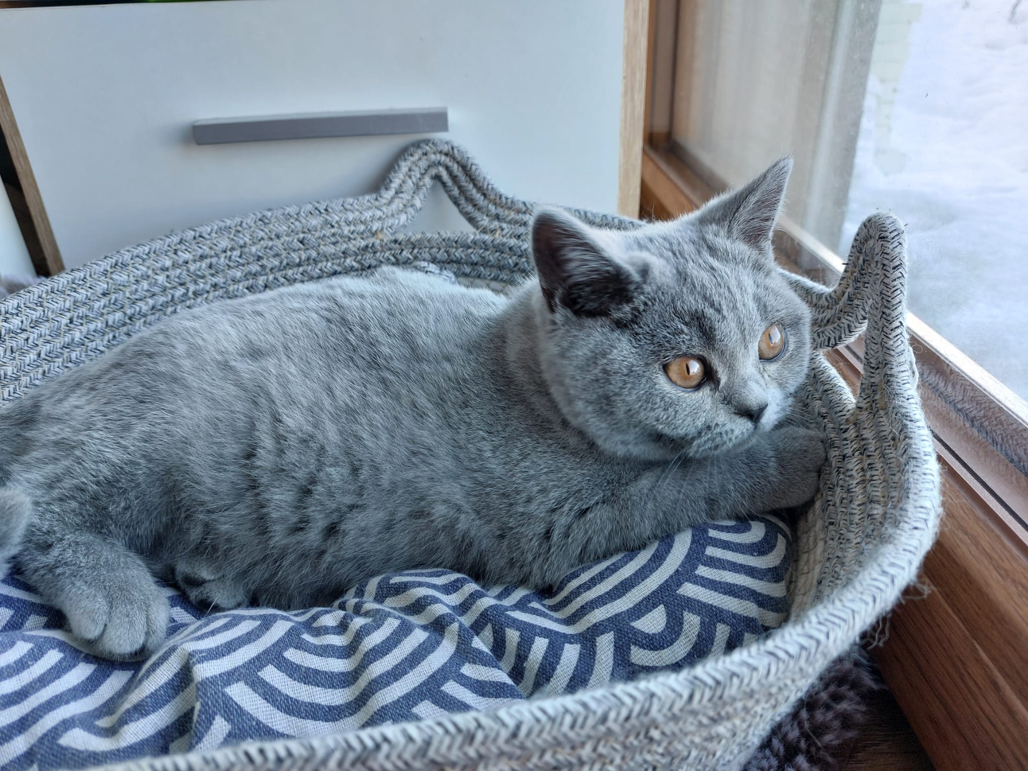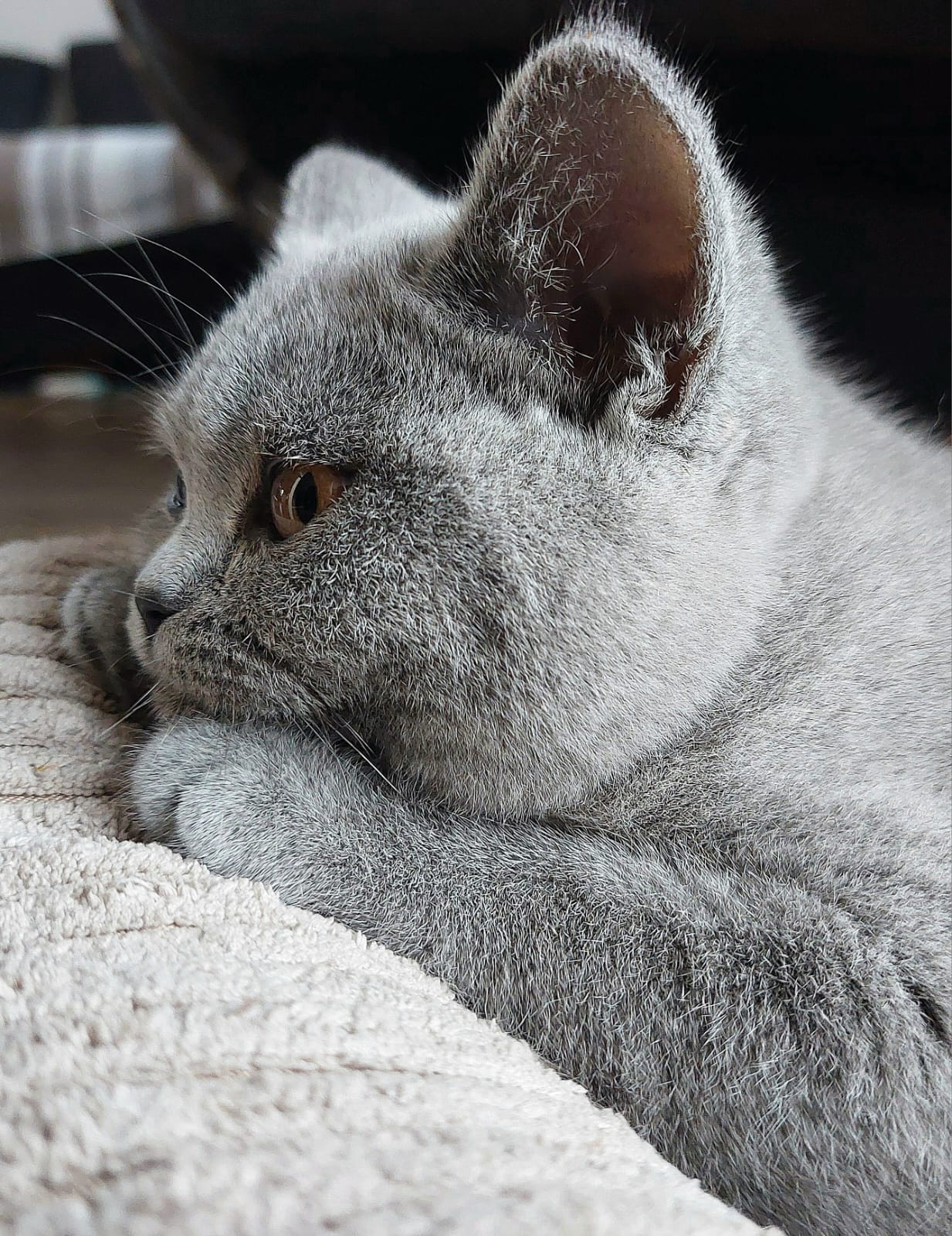 Die Mama Polly ist ein Britisch Kurzhaar blaues Weibchen (BRI a)