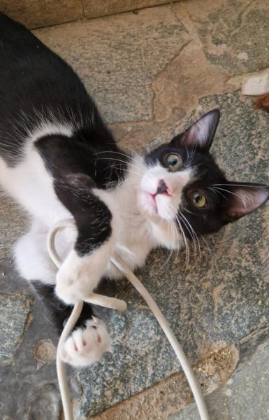 Ninjás Geschichte: Dieser mutige Junge wurde aus einem Auto-Motor gerettet, in dem er gefangen war. Es kommt oft vor dass die kleinen Katzen sich in Automotoren verstecken wenn sie Angst haben. Ein netter Mann befreite ihn und brachte ihn in eine Tierklinik. Ninja musste die ersten Monate in einem Käfig sein, da es keine andere Möglichkeit gab. Aber es machte ihm nicht so viel aus. So bald jemand zu ihm kam war er glücklich wenn er gestreichelt wurde und Aufmerksamkeit bekam. Am liebsten kuschelt er auf dem Schoss.