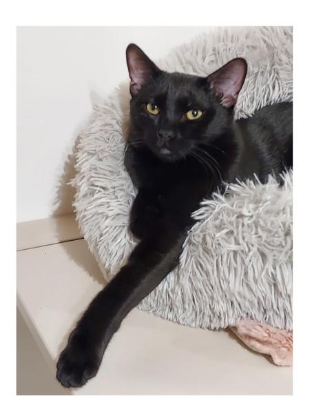 Er ist sehr schöner Kater, lieb, hat einen sanften Blick und ist sozial mit anderen Katzen, jedoch Menschen gegenüber noch schüchtern. Streicheln lässt er sich nur ab und zu, er macht jedoch täglich klitzekleine Fortschritte. Er liebt es zu fressen, bequem zu schlafen, spielt und ist neugierig. Wir denken, dass er bei geduldigen Menschen schnell auftauen wird.