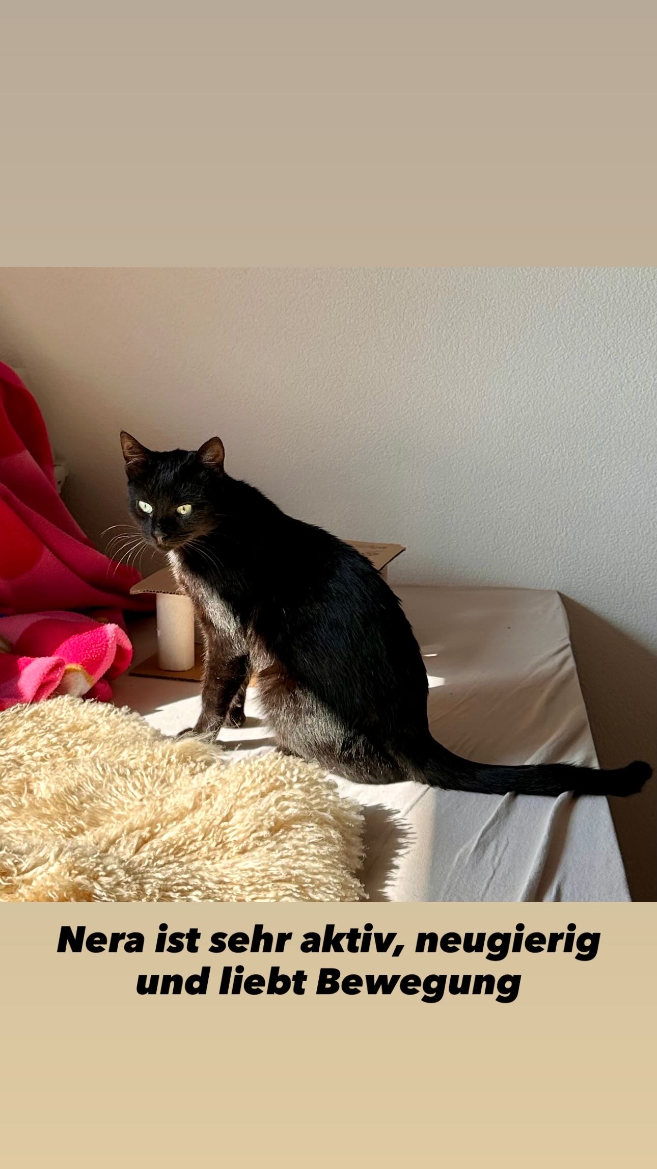 Nera ist sehr aktiv, neugierig und liebt Bewegung – sie braucht viele Beschäftigungsmöglichkeiten und wäre gerne draußen unterwegs.