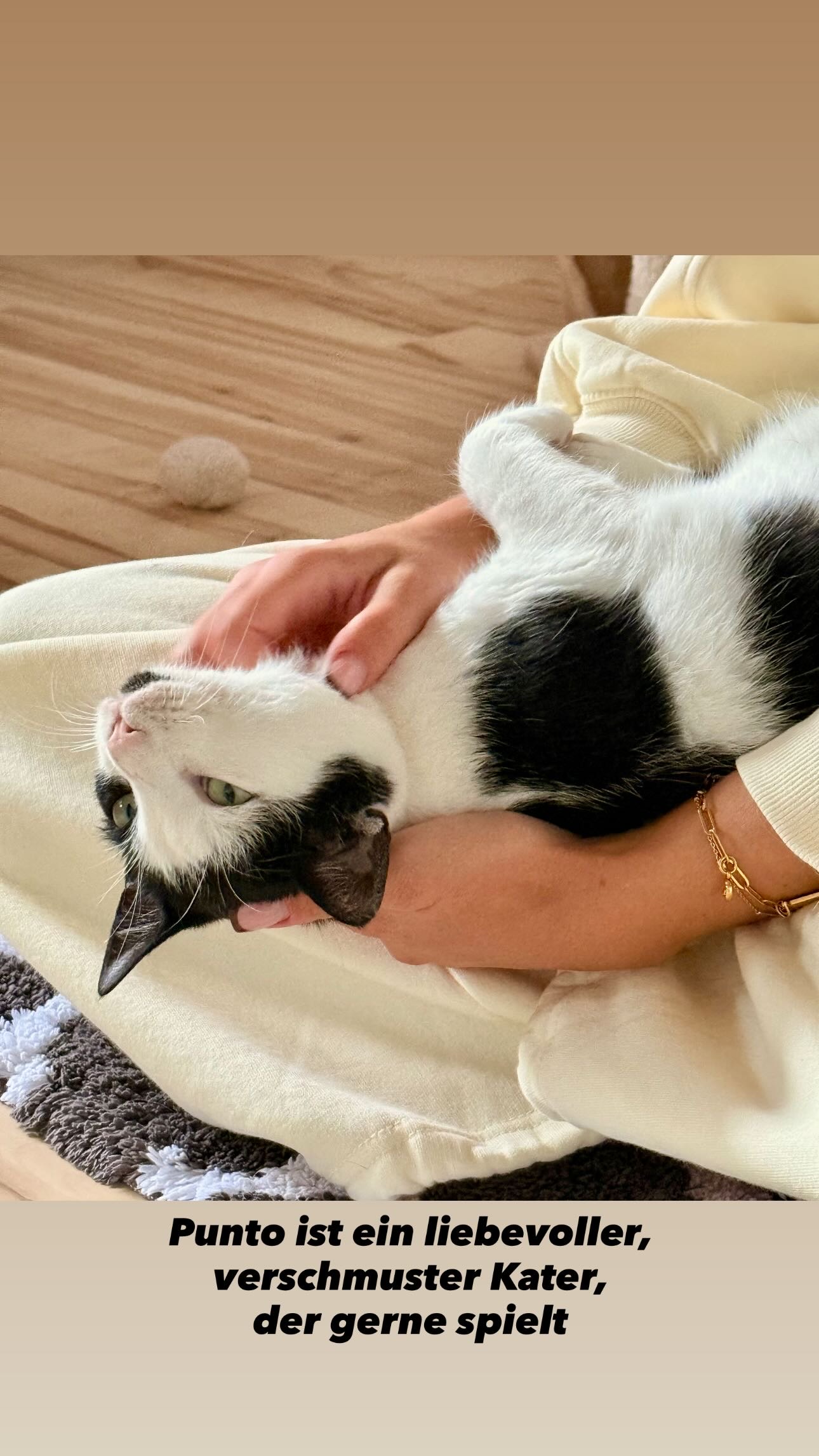 Punto ist ein liebevoller, verschmuster Kater, der gerne spielt. Anfangs kann er etwas schreckhaft sein, fasst aber schnell Vertrauen und sucht viel Nähe.
