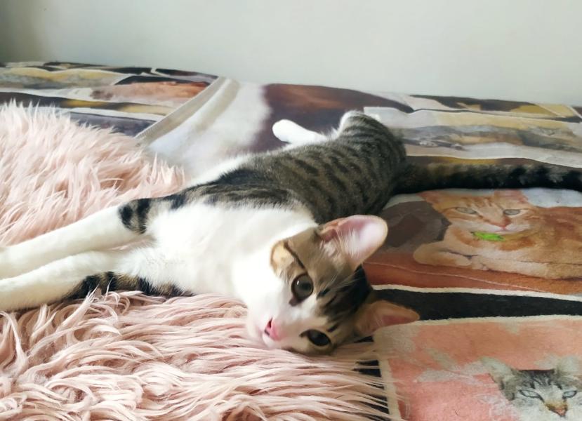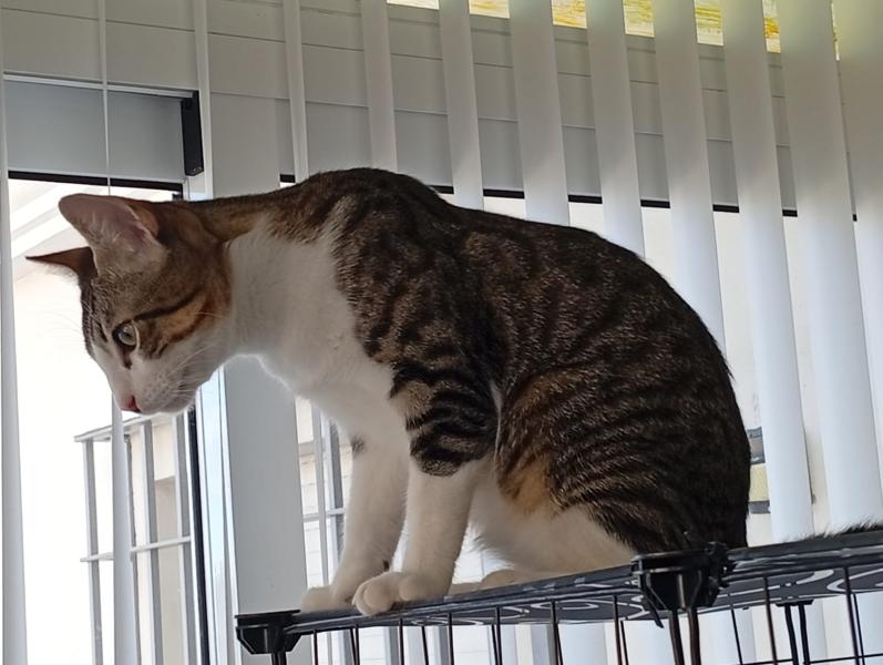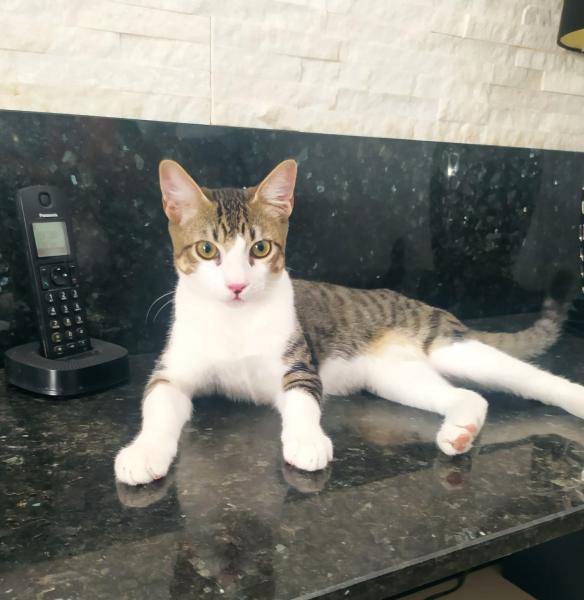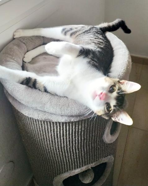 Er wurde mit seinen 2 Geschwistern in der Nähe eines Einkaufzentrums dehydriert aufgefunden. Wahrscheinlich ist die Katzenmutter verunfallt. Eine der beiden Schwestern hat ebenfalls überlebt und ein Zuhause in Spanien gefunden.