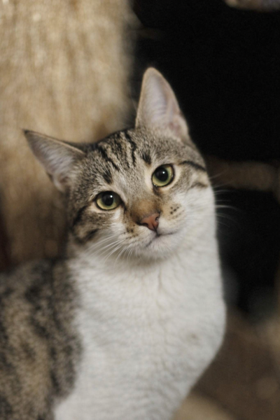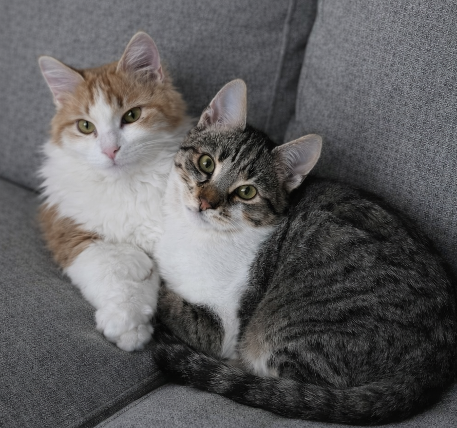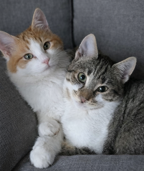 Belinos (grau-weiss) wurde im Alter von nur zwei Monaten aus einem Auto-Motorraum gerettet, in dem er sich ängstlich versteckt und verzweifelt geweint hatte. Er war zunächst sehr vorsichtig und schreckhaft – bis er Renos traf. Vom ersten Moment an waren die beiden unzertrennlich. Renos wurde sein Freund, sein Beschützer und sein sicherer Hafen. Dank ihm hat Belinos Vertrauen gefasst und gelernt, sich geborgen zu fühlen.