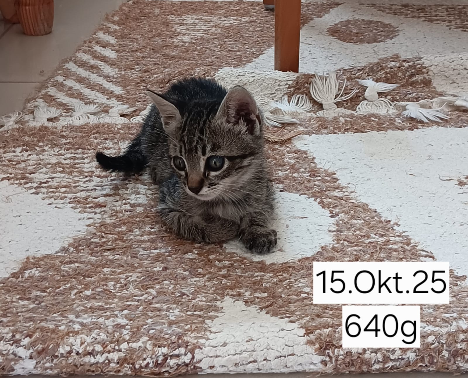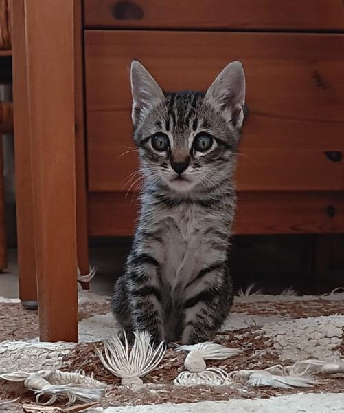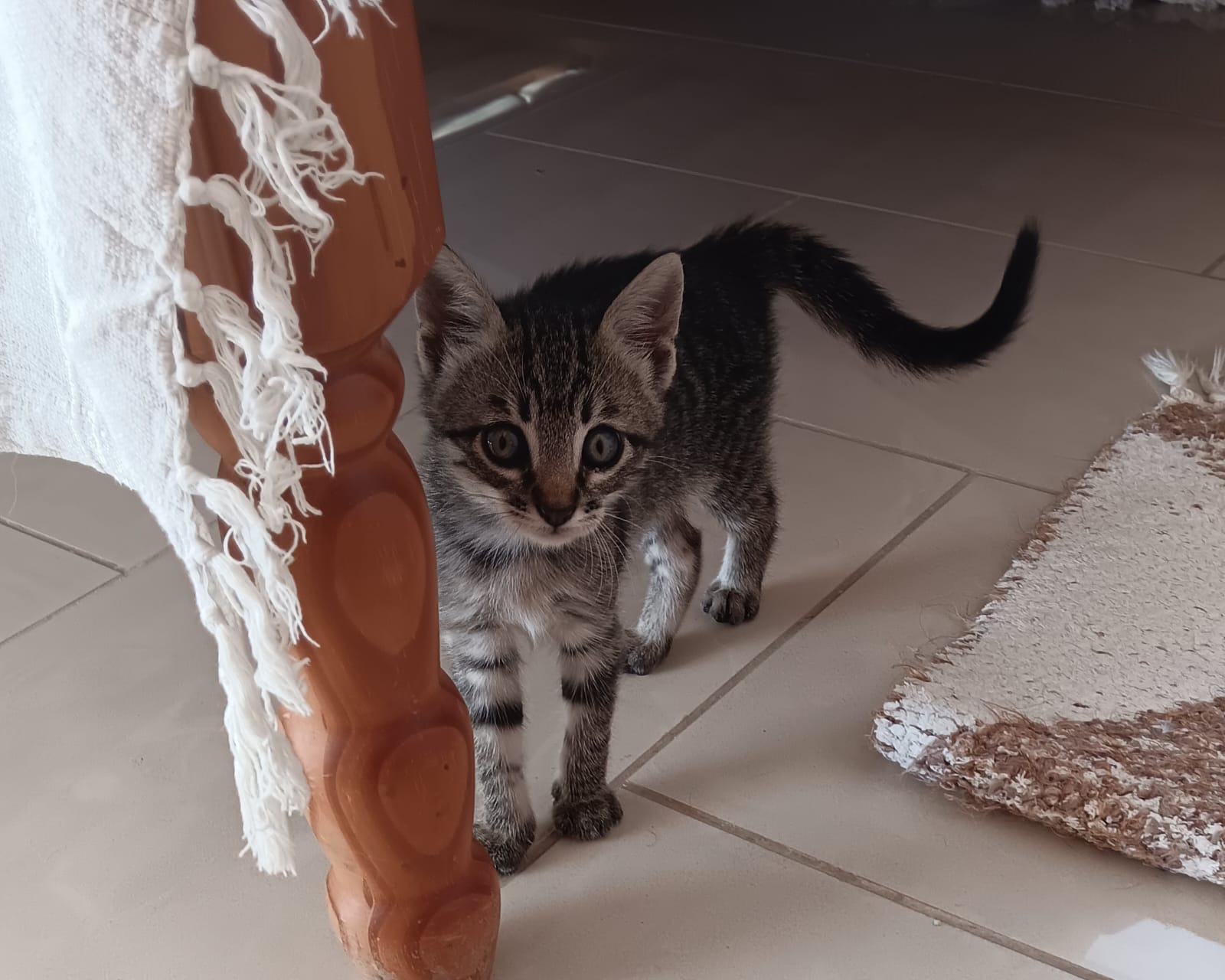Dieses hübsche Mädchen lebt im Süden von Rhodos auf einer Pflegestelle. Sie wächst dort in Gesellschaft gleichaltriger Kitten und mit einem grossen, katzenfreundlichen Collie auf.