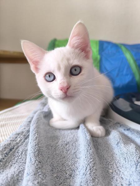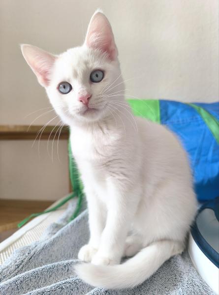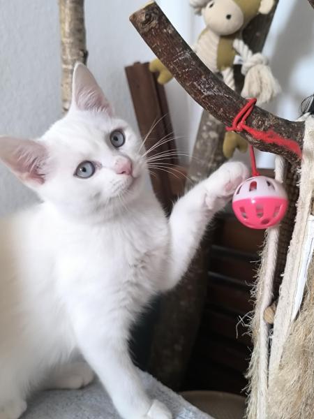 Seine Mutter ist eine BKH und sein Vater ein Ragdoll x Hauskatze. Er hat leuchtend blaue Augen und seidiges Fell.