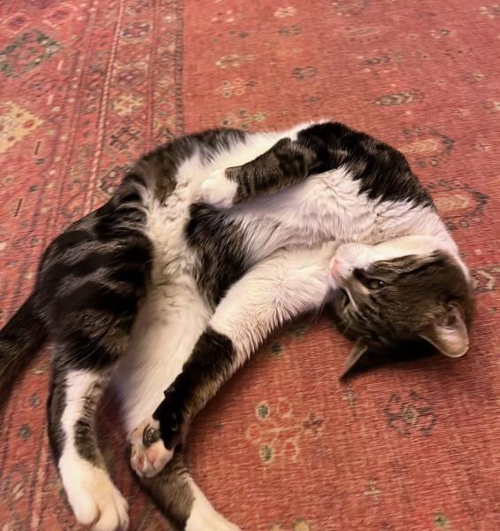 Smokey ist extrem verschmust, kommt sofort und schmiegt sich an die Beine. Er ist recht fordernd für Aufmerksamkeit.