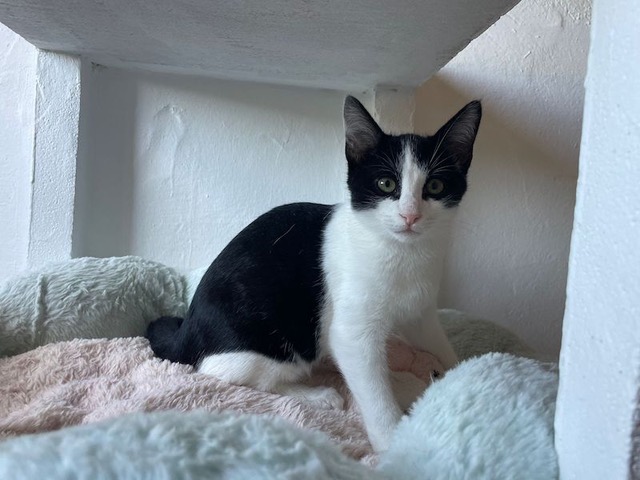 Der hübsche schwarz-weisse Spanier Suerte ist ein freundliches Katerchen, das seine Gspändli sehr liebt. Mit ihnen tollt er durch das ganze Katzenhaus, kuschelt gerne und spielt für sein Leben gerne. Er liebt Streicheleinheiten und ist dem Menschen zugetan.