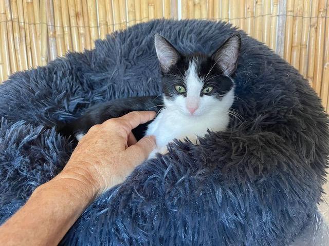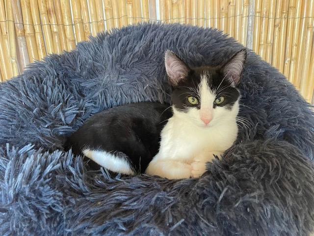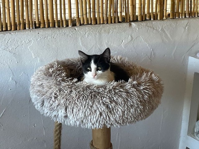Der elegante schwarz-weisse Spanier Suerte ist ein freundliches Katerchen, das seine Gspändli sehr liebt. Mit ihnen tollt er durch das ganze Katzenhaus, kuschelt gerne und spielt für sein Leben gerne. Er liebt Streicheleinheiten und ist dem Menschen zugetan.