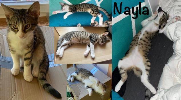 • Ein bezauberndes getigertes Weibchen mit weisem Hals und Pfoten. (Nayla)