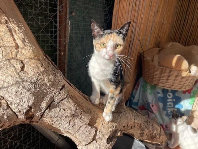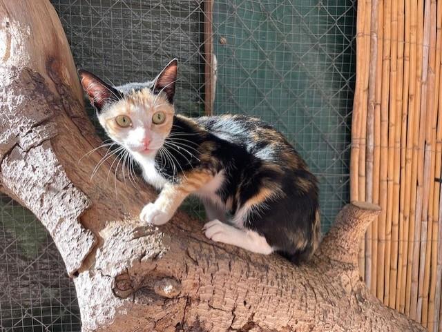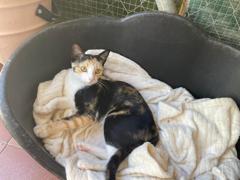 Das hübsche Tricolor Katzenmädchen Trixie wurde völlig eingeschüchtert in einer Katzenkolonie gefunden. Tierschützer nahmen es mit und brachten Trixie in die Auffangstation.