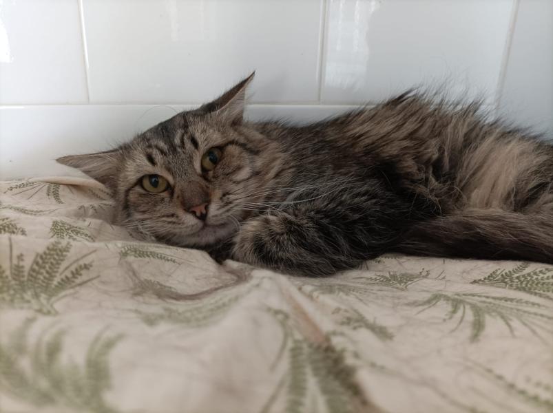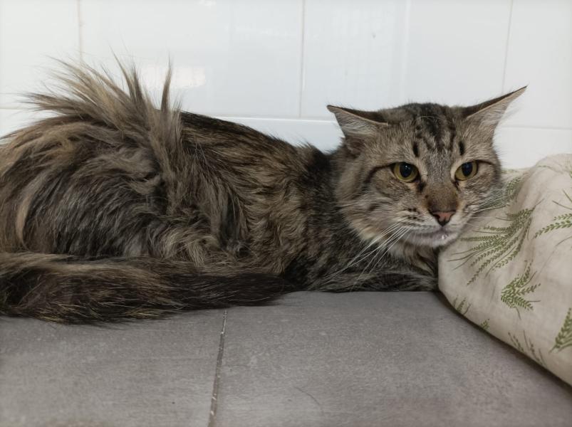 Da sein Fell recht lang ist, braucht er etwas Pflege – wer ihn adoptiert, sollte also bereit sein, ihn regelmässig zu bürsten ✨🐈⬛.