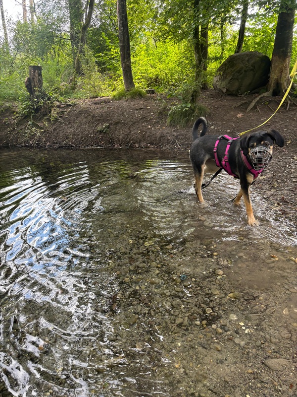 Hat sie Vertrauen gefasst, zeigt sich Bella verspielt, neugierig und voller jugendlicher Energie. Sie liebt gemütliche Spaziergänge, plantscht begeistert im Wasser und probiert gerne neue Dinge aus, sei es eine Leckerli-Suche oder das Balancieren über Baumstämme.