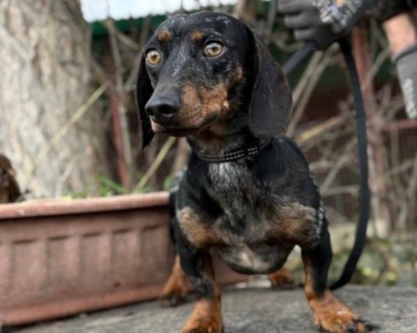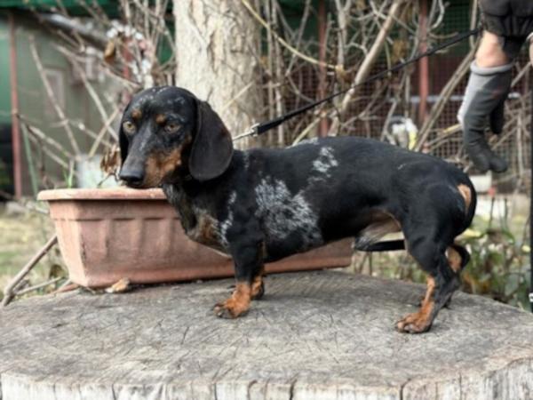 Pflegebericht vom 21.12.25: "Dio ist eher ein Einzelgänger. Er braucht nicht wirklich andere Hunde um sich herum um glücklich zu sein. Er akzeptiert andere Hunde, interagiert aber gar nicht mit ihnen. Dio ist ein typischer Dackel, sehr stur, sehr witzig und sehr liebevoll. Er muss noch vieles lernen und braucht daher klare Grenzen und Strukturen. Anhand seinen Ohren, sieht man gut, dass auch er öfter in seiner Vergangenheit angegriffen wurde. Er greift meine Rüden nicht immer an. Er attackiert aus Eifersucht oder allenfalls auch aus Ressourcenverteidigung. Deshalb trägt Dio einen Maulkorb. Er ist aber nicht von meinen Hunden getrennt. Er kuschelt sich zum Schlafen an sie. Er akzeptiert den Maulkorb ganz gut. Auch er geniesst die Zuneingung und Aufmerksamkeit sehr!"