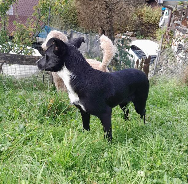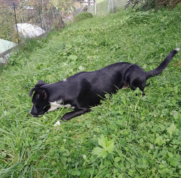 Josie durfte ende September auf ihre Pflegestelle in Ebnat-Kappel reisen, wo sie, nach Absprache, gerne besucht werden darf. Sie ist eine überaus freundliche kleine Hündin, die noch sehr verspielt und welpenhaft in ihrem Verhalten ist. Sie kommt mit allen Hunden im Rudel gut zurecht und holt sich gerne Streicheleinheiten bei ihren Bezugspersonen ab, kann da auch mal etwas fordernd sein, akzeptiert Grenzen jedoch gut. Josie geht offen aber vorsichtig an Neues heran und lernt schnell dazu. Sie kommt bereits gut zur Ruhe und kann sich auch selbstständig beschäftigen, nicht nur zur Freude der Pflegemama (Schuhe umgestalten, Löcher buddeln im Garten, usw.). Draussen läuft Josie schon ganz ordentlich an der etwas längeren Leine. Aussenreize sind ihr zwar noch etwas suspekt, sie orientiert sich jedoch gut am Rudel und an ihrer Bezugsperson. Die kleine Maus ist bereits stubenrein, fährt gerne Auto und kann schon etwas alleine sein gemeinsam mit dem Rudel. Katzen und Kleintiere lernt Josie gerade kennen. Die findet sie noch sehr interessant, lässt sich aber problemlos auslenken.