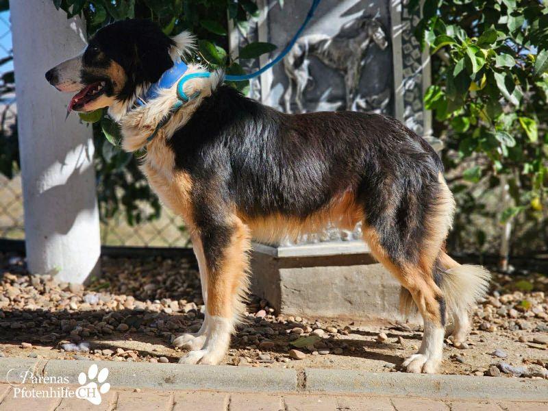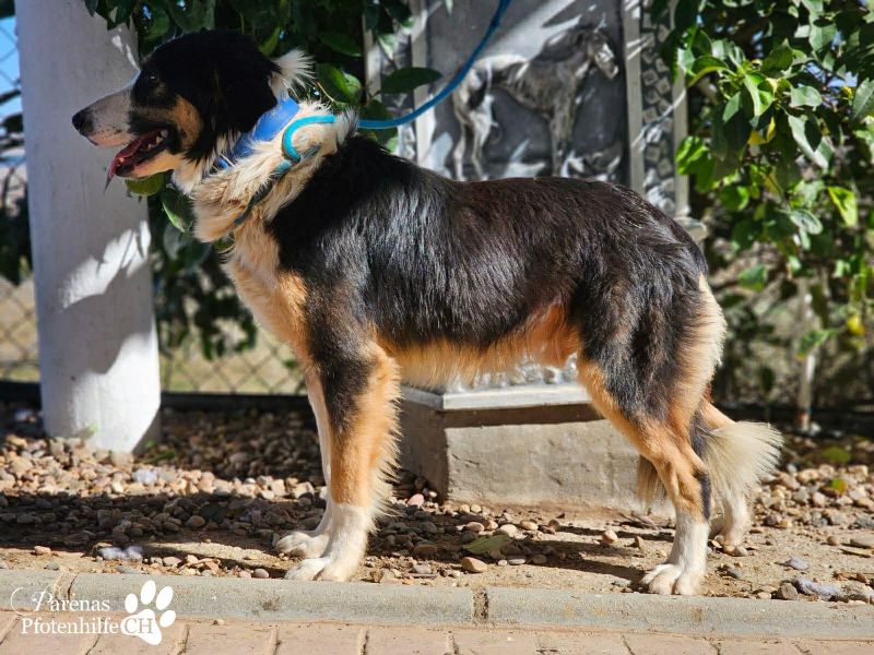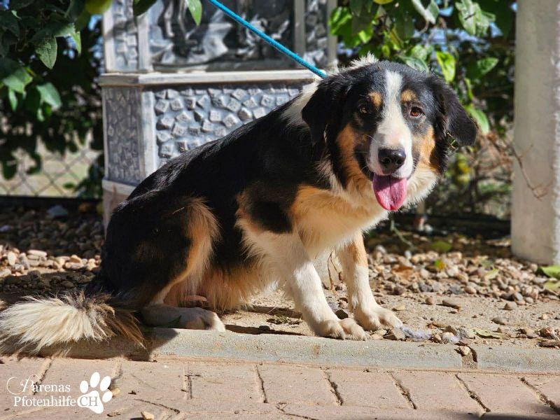 Kalypso, ein hübscher Border-Collie-Rüde, stand einfach vor dem Tor des Refugios und brachte sich damit selbst in Sicherheit. In neuen Situationen zeigt sich Kalypso anfangs etwas unterwürfig und braucht einen kurzen Moment, um Vertrauen zu fassen. Hat er dieses gewonnen, taut er schnell auf und zeigt sein wahres Wesen: sehr verschmust, anhänglich und ausgesprochen menschenbezogen. Nähe und Zuwendung sind ihm deutlich wichtiger als Action oder permanente Beschäftigung. Der fröhliche und verspielte Junghund zeigt sich im Umgang mit anderen Hunden verträglich und sozial, sodass ihm vierbeinige Gesellschaft in seinem neuen Zuhause sicher gefallen würde.