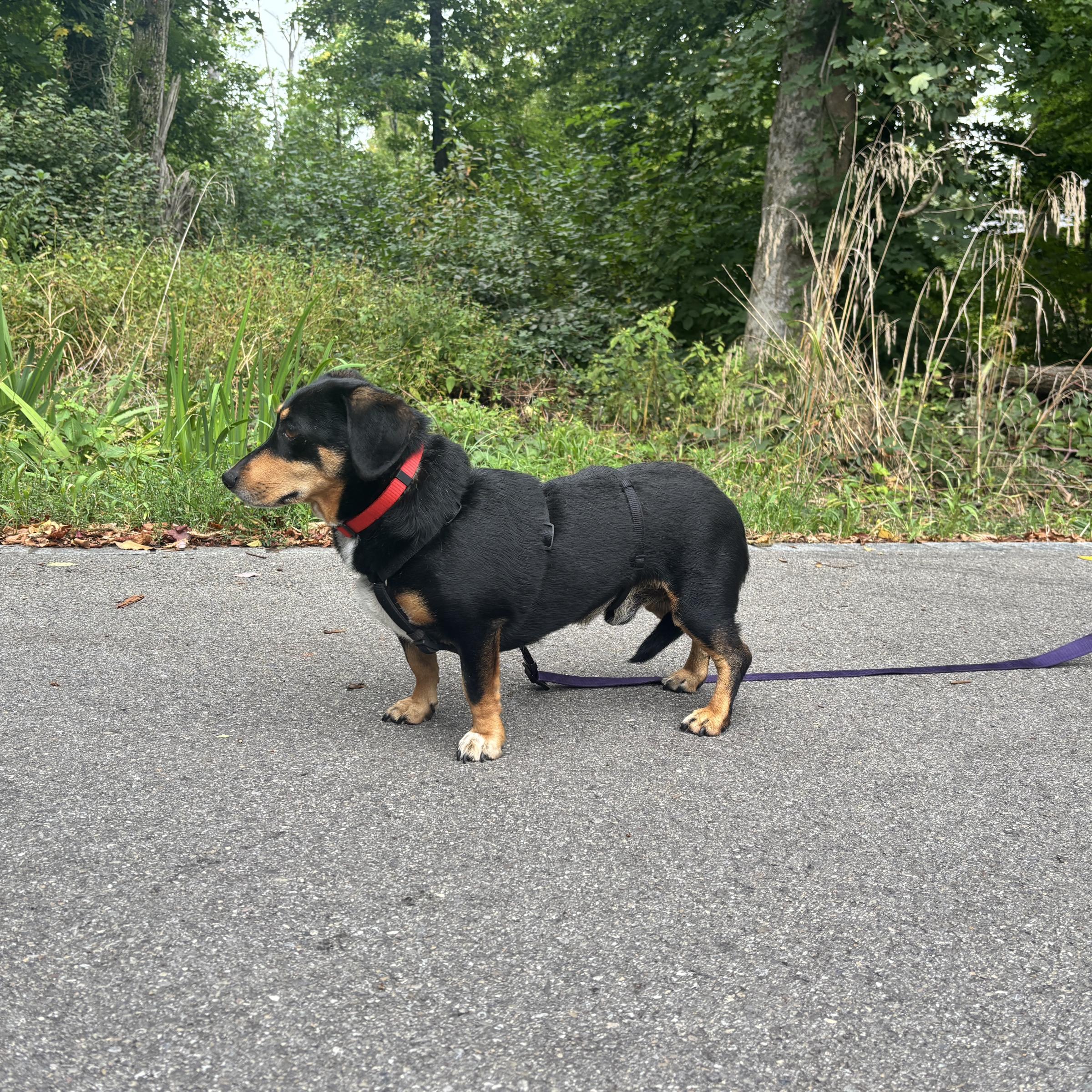 Mex geniesst es spazieren zu gehen, seine Rute und der ganze Körper wackelt dann vor Freude. Er läuft auch super an der Leine. Aktuell fehlt ihm noch etwas Kondition, auch später sollte die Aktivität seinen kurzen Beinen angepasst sein.