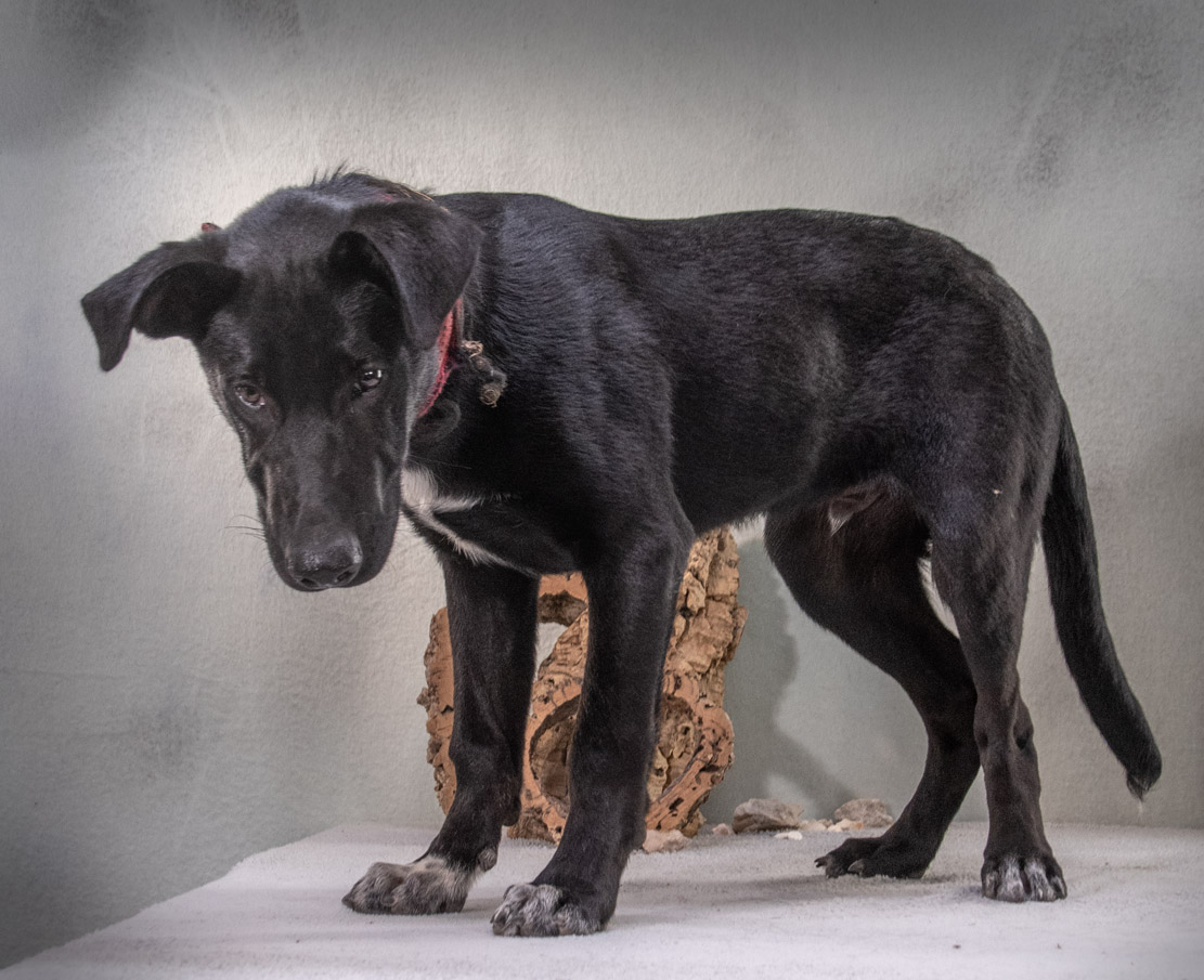Pino ist ein Mischlingsrüde, geboren im Februar 2024, mit einer Schulterhöhe von etwa 53 cm. Er stammt aus Portugal, wo er als Welpe angebunden im Wald gefunden wurde – ohne Futter, ohne Wasser und in einem stark geschwächten Zustand. Der Strick um seinen Hals hatte sich bereits tief eingeschnitten, doch Pino hatte das Glück, rechtzeitig gerettet zu werden.