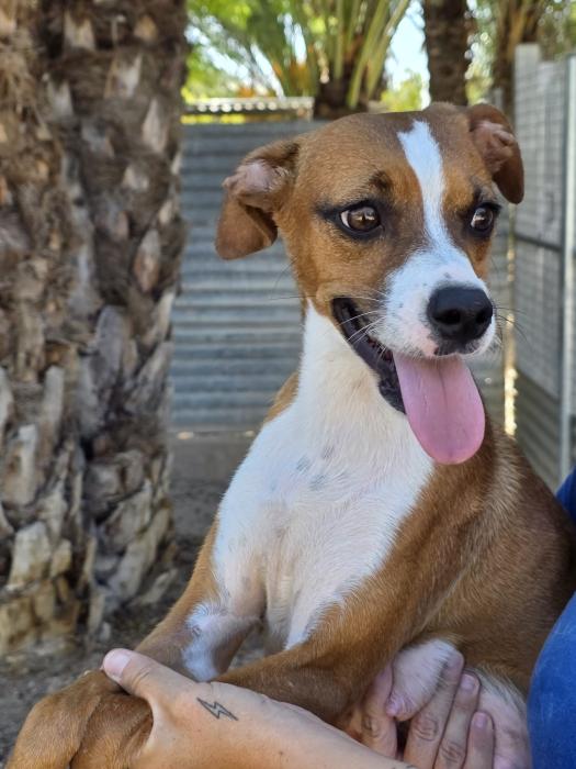 Terma wurde zusammen mit Gorgolito und ihrer Schwester in den Anhöhen oberhalb von Albatera gefunden. Die drei waren bei brütender Hitze unterwegs, sie hochträchtig, am Ende ihrer Kräfte und auf verzweifelter Futtersuche. Zum Glück wurden sie gefunden und gerettet – lange hätte sie nicht mehr überlebt. Am 30.07.2025 brachte Terma im Tierheim dann ihre Welpen zur Welt – nur zwei überlebten, Gerda und Benita.