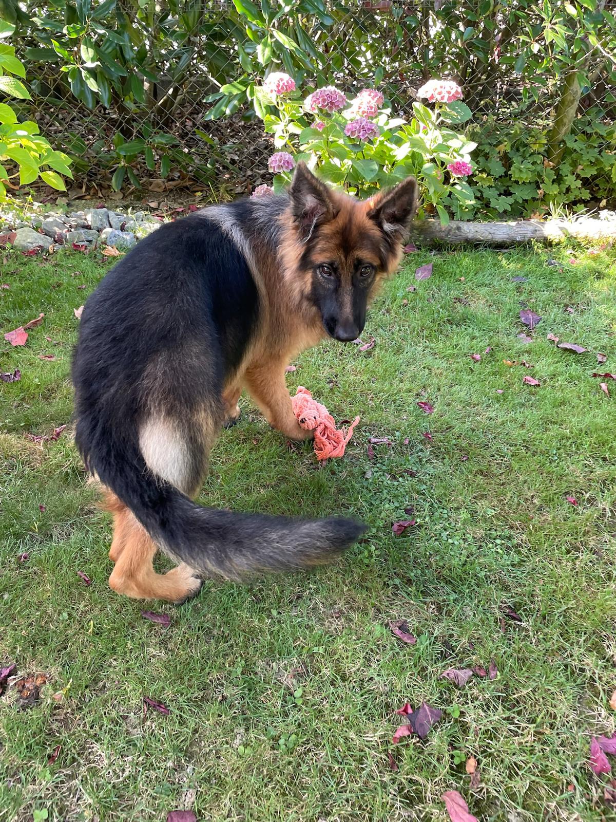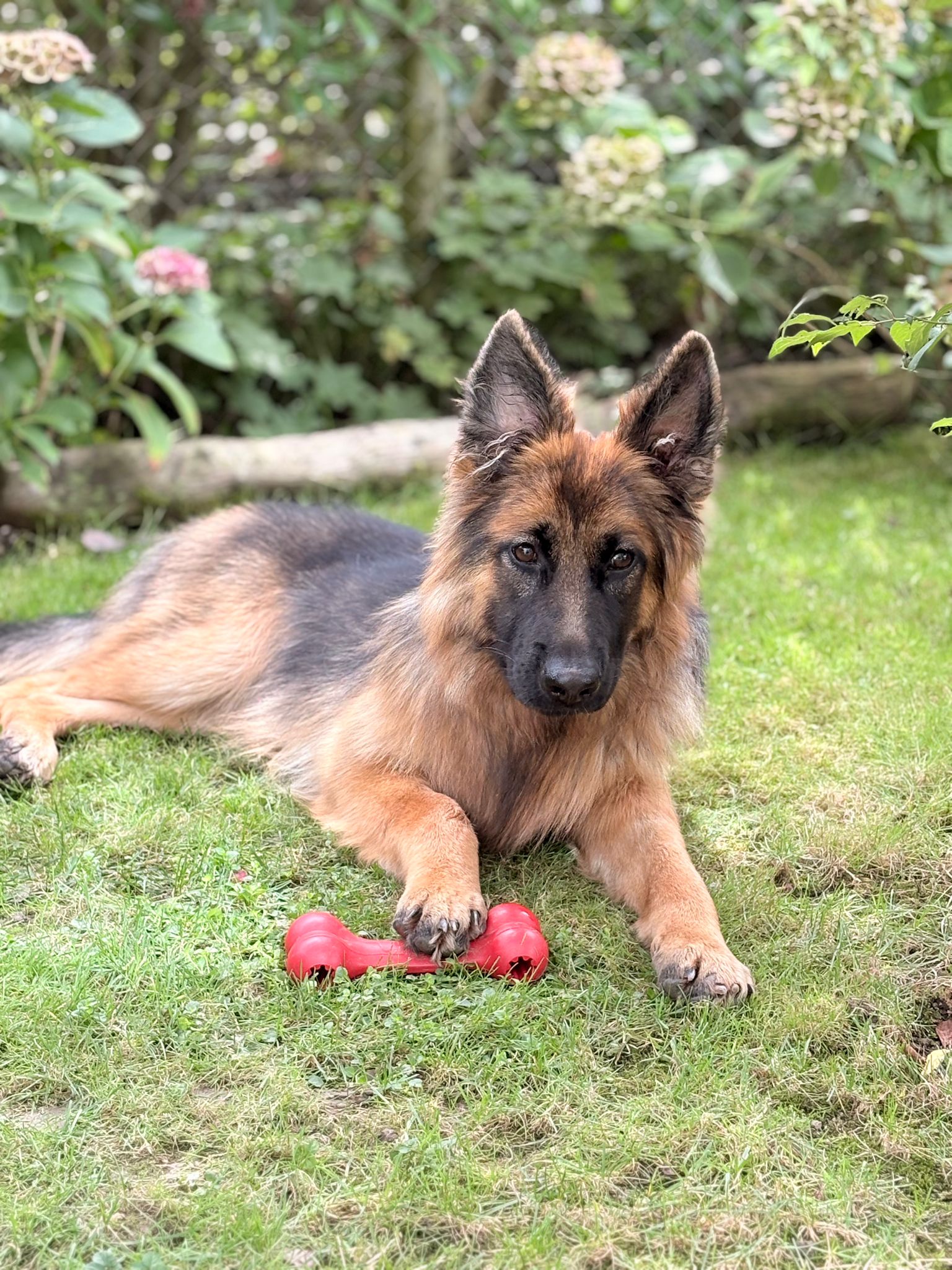 Sie ist schäferhundetypisch lernbegierig und möchte gefallen. Aktuell braucht sie aufgrund eines Traumas noch Physiotherapie.