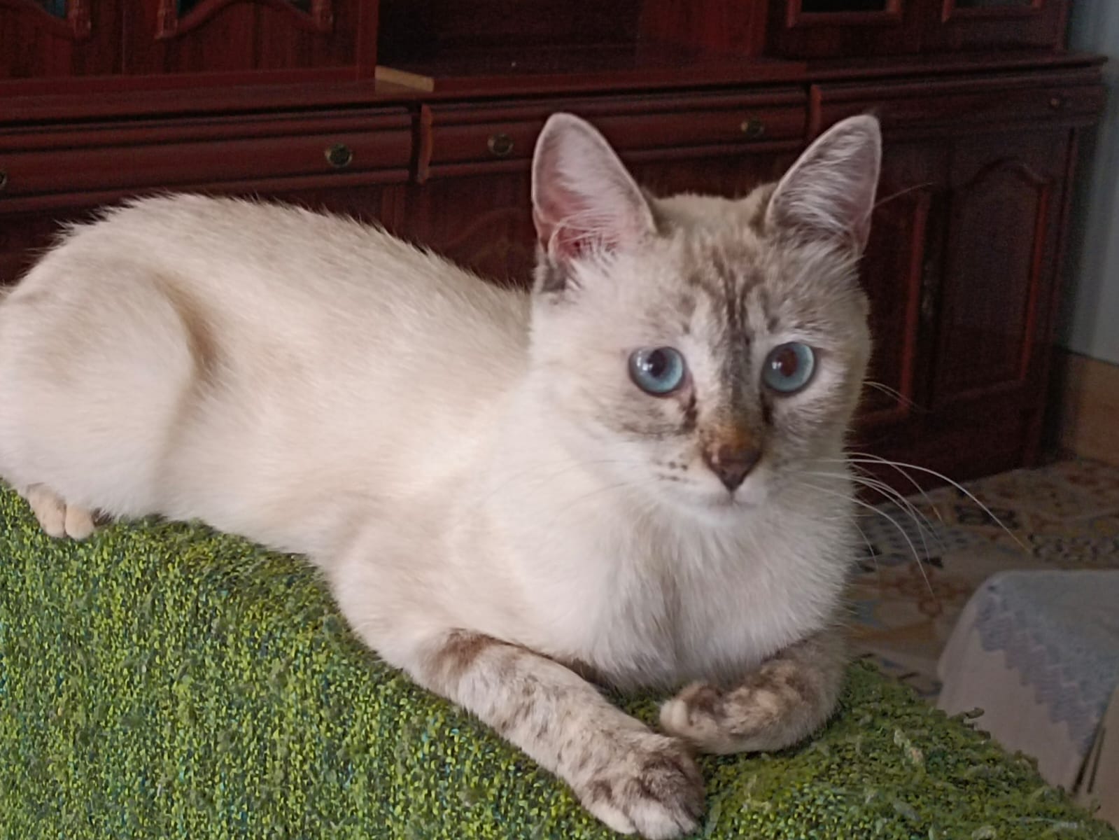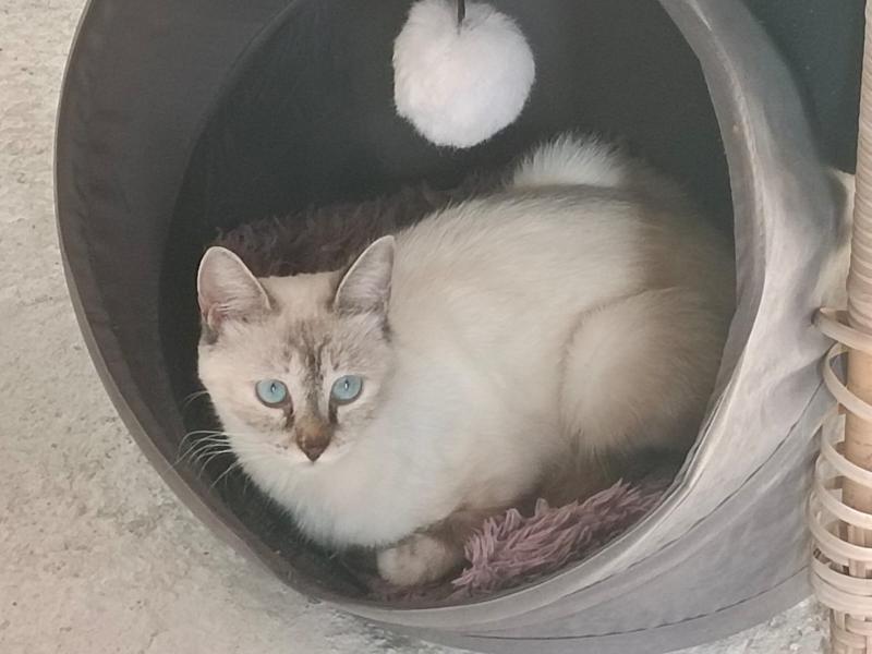 Das zierliche Katzenmädchen Alba wurde in einer kleinen Kolonie von Strassenkatzen in der Nähe einer Arbeiterbaracke auf dem Land entdeckt. Die Katzen wurden von den Arbeitern jeweils mit Essensresten gefüttert, waren ansonsten aber auf sich allein gestellt. Einer der Arbeiter erzählte Tierschützerin Mari Luz, dass dort seit kurzem ein kleines Kätzchen sei, allein und körperlich sehr geschwächt. So kam Alba im Dezember 2024 ins Tierheim – am Rande ihrer Kräfte, mit starkem Durchfall und Fieber sowie voller innerer und äusserer Parasiten. Das kleine Wesen hätte draussen in der Kolonie den Winter nicht überlebt. Alba ist eine sehr schüchterne kleine Katze und hat es noch nicht geschafft, tiefes Vertrauen zu einem Menschen aufzubauen. Manchmal lässt sie sich kurz streicheln, manchmal auch nicht. Sie hat keine Probleme mit den anderen Katzen im Tierheim und eine besondere Bindung zu Erin. Sie orientiert sich stark an ihrer Freundin und sucht sie auf, um zu spielen, zu kuscheln etc.