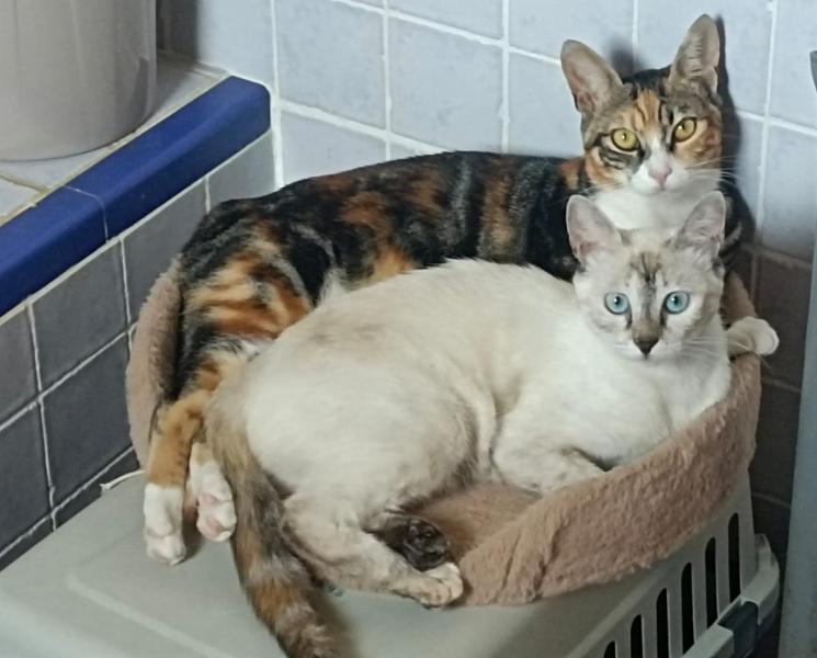 Erin (Tricolor, geb 08/24) und Alba (beige, geb 09/24) könnten unterschiedlicher nicht sein. Trotzdem sind sie beste Freundinnen und werden nur gemeinsam vermittelt und befinden sich zur Zeit in einem Tierheim in der Nähe von Malaga.