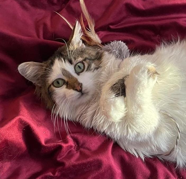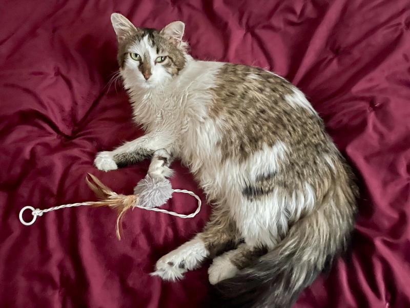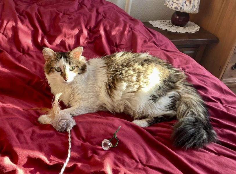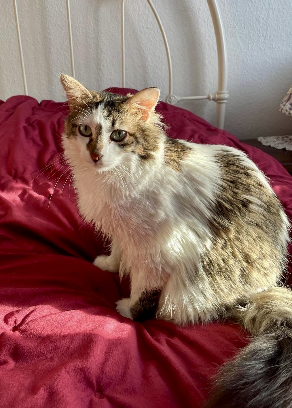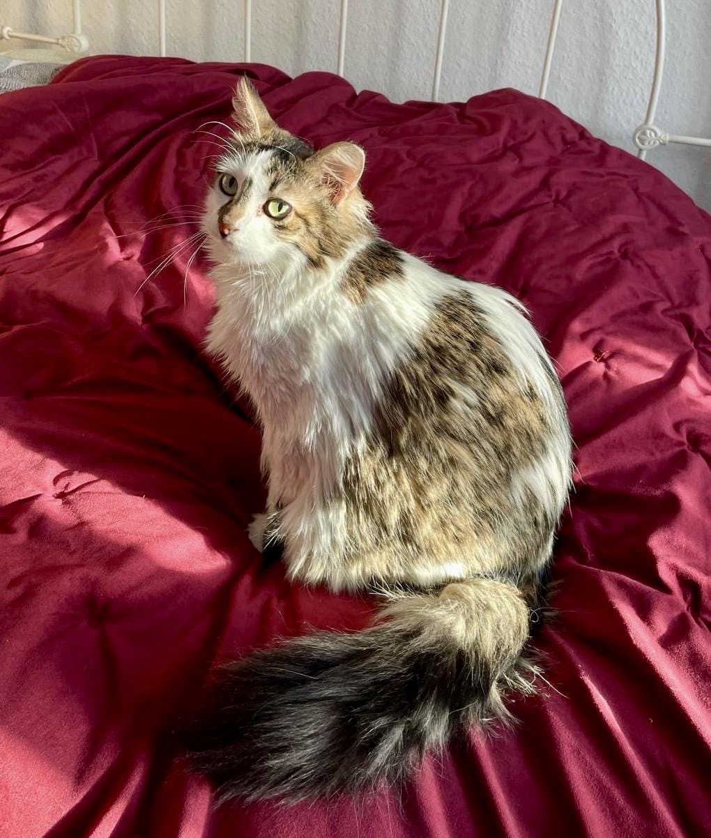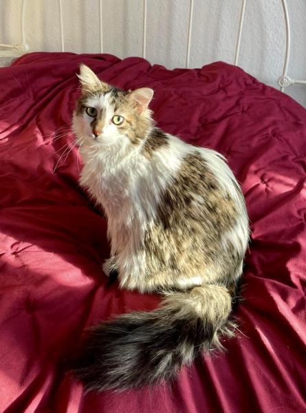 Bonnie hat etwas längeres Haar und einen buschigen Schwanz der regelmässig Pflege bedarf. Sie ist eine feine, süsse Katze, sehr sozial mit anderen Tieren und hat einen lieben, eher ruhigen Charakter.