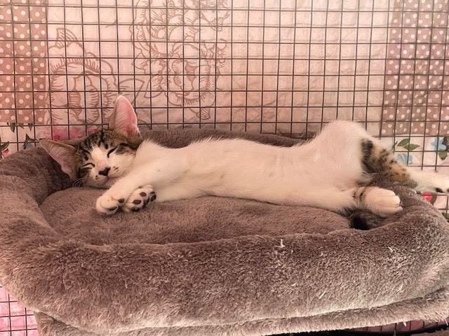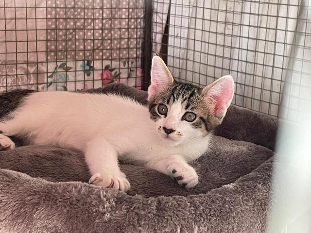 Das hübsche Katzenkind Dama wurde mit der Mama und den beiden Geschwisterchen in einer Katzenkolonie gefunden und mit der Falle eingefangen. Nach dem Tierarztbesuch durfte die ganze Familie in die Auffangstation ziehen.