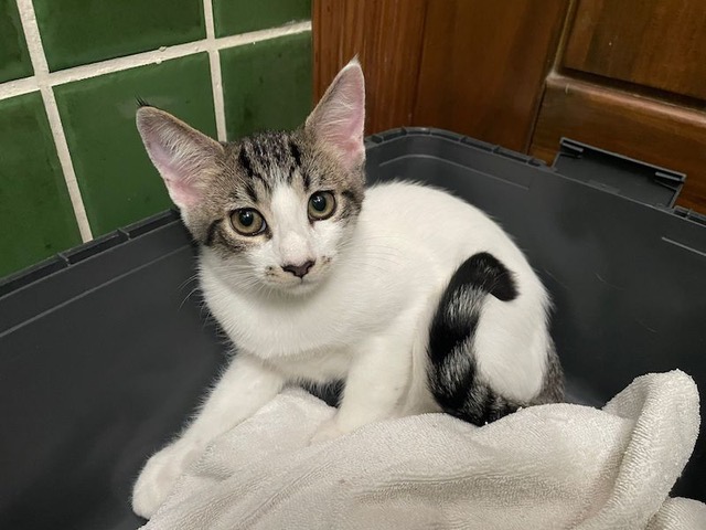 Das hübsche Katzenkind Dama wurde mit der Mama und den beiden Geschwisterchen in einer Katzenkolonie gefunden und mit der Falle eingefangen. Nach dem Tierarztbesuch durfte die ganze Familie in die Auffangstation ziehen.