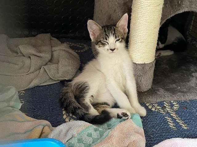 Das hübsche Katzenkind Dama wurde mit der Mama und den beiden Geschwisterchen in einer Katzenkolonie gefunden und mit der Falle eingefangen. Nach dem Tierarztbesuch durfte die ganze Familie in die Auffangstation ziehen.